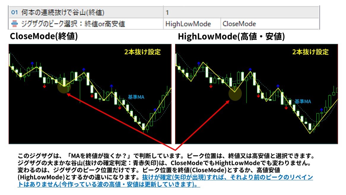 ②ジグザグの設定 ジグザグの谷・山は、終値の抜けで決定されます。連続何本抜けで谷・山と判断するか?また、ジグザグ描画のピークを「終値:CloseMode」とするか、「高値・安値:High LowMode」とするかを設定します。2回以上がおススメです。