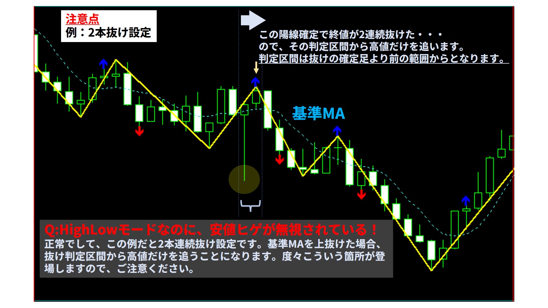 注意点:ヒゲを検出できていない!? 例えば、連続2本抜けであれば、抜け確定の終値ローソク足より1本前のローソク足から判定しますので、下図右のようなケースでは、安値ヒゲをつけた陽線(終値が基準MA抜け)から高値を追いますので、安値ヒゲはスルーされてしまいます。