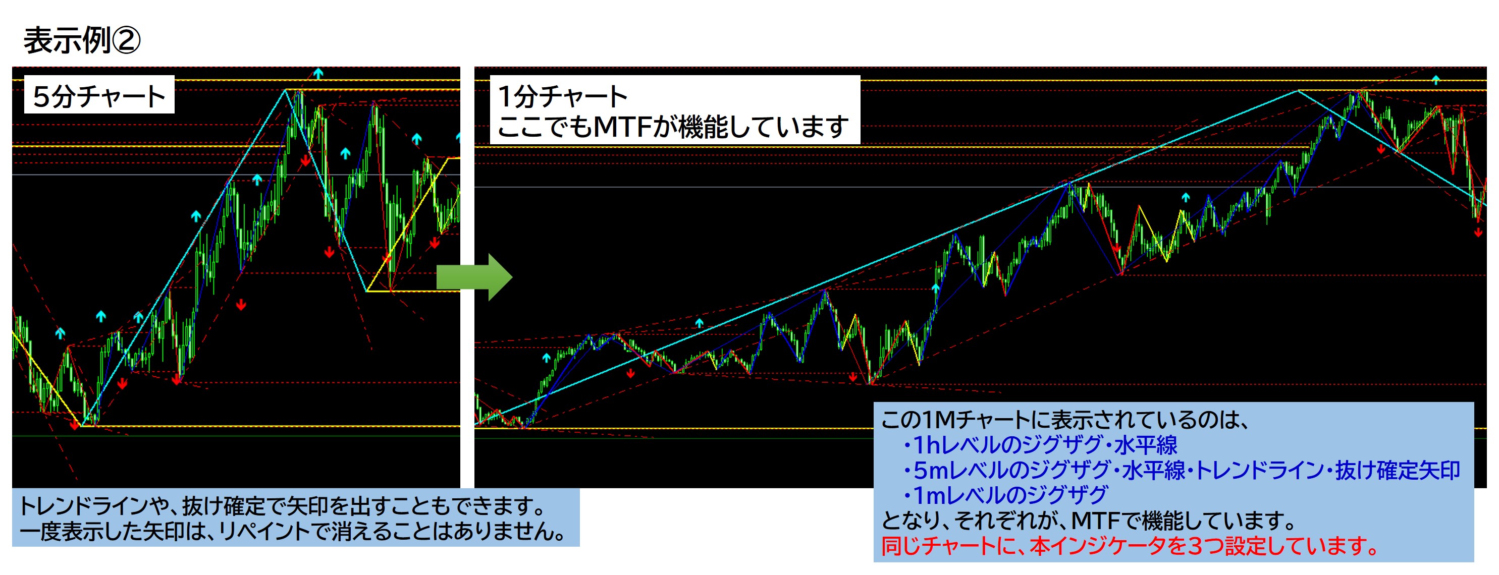 注意点:MTF表示時に矢印が見難い場合があります 矢印もMTFで機能しますが、位置によってはローソク足と重なって見難い場合がありますので、ご注意ください。下図では、5分足チャートにおいて、矢印位置は見やすいですが、1分足で見ると埋もれてしまうことがあります。