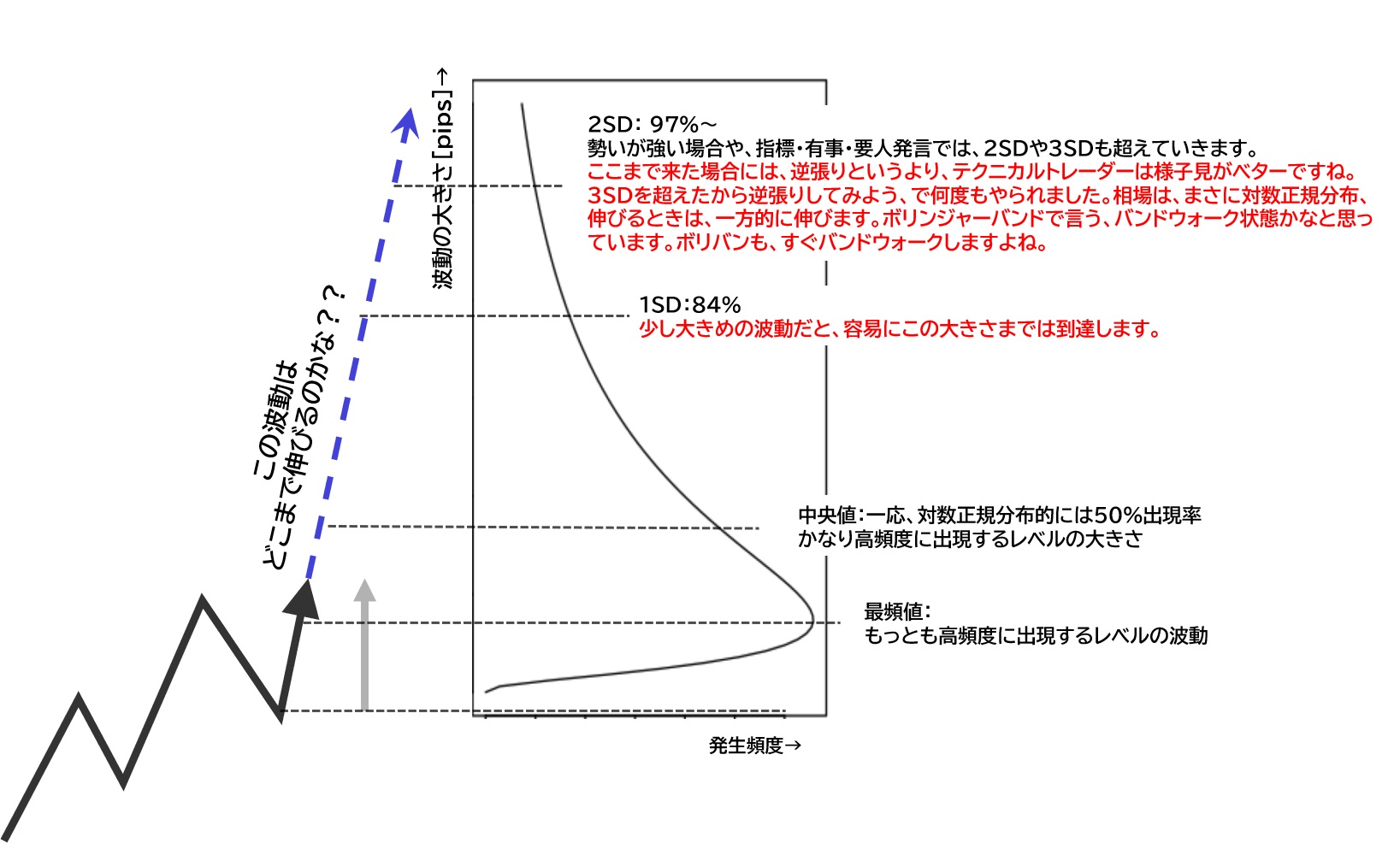 トレードでの活用方法: 例えば、波動が1σ(1SD)まで上昇している場合、累積的な確率は84%程度になります。更に伸びる余地は小さいと判断する、みたいなイメージです。※標準偏差というと一般には68.27%を想像すると思いますが、それは正規分布において平均値±標準偏差の範囲です。ここでは、累積的な値(上限側)です。しかし!2SDだろうが3SDだろうが、平気で動く場合があります。注意してください。波動の大きさの設定にもよりますが、2SDや3SDまで来たから逆張りしよう、というのは、危険で、むしろ、2~3SDまで値が動いた場合には、指標発表や要人発言、何か生じた可能性を考慮し、「テクニカルが機能しない可能性」を考えた方が良いです。つまり、テクニカルトレーダーは様子見すべきと考える方が無難です(このあたり、ジグザグ波形の大きさにもよります)。