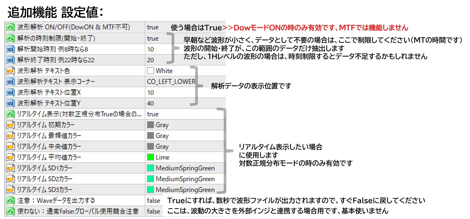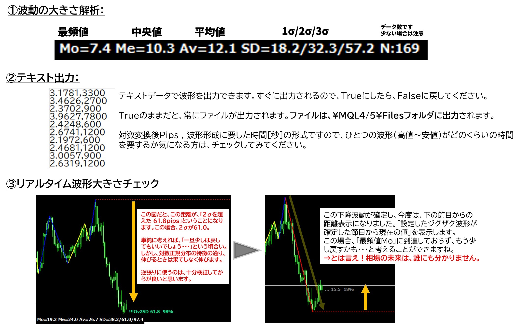 ①これまで、HK50のような開場閉場時間が不規則・途中に休憩時間があるような銘柄は、MTFジグザグの描画に異常が生じていました。今回のアップデートでこれを解消し、どの銘柄でも、MTFジグザグが機能するようになりました(日足以下)。 ②MT5版のみになりますが、「これまではジグザグのタイムフレームに対して、割り切れる数値のタイムフレームのみでMTF表示ができました」が、今回のアップデートで、それを修正しました。例えば、M5ジグザグをM3チャートで表示させることが可能になりました。M5ジグザグの頂点は5分単位ですので、M3と時間軸は一致しませんが、最も近しいローソク足にピークが描画されることになります。 ③その他細かい修正をいれています:波形解析モードは対数正規分布のみ、外部グローバル変数の値(対数正規分布のパラメータ)を選択可能 など
