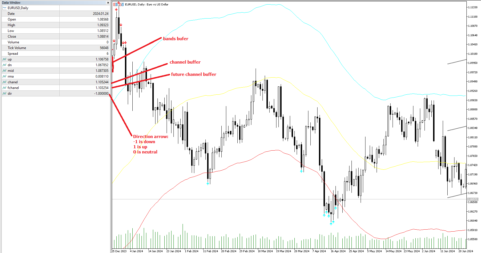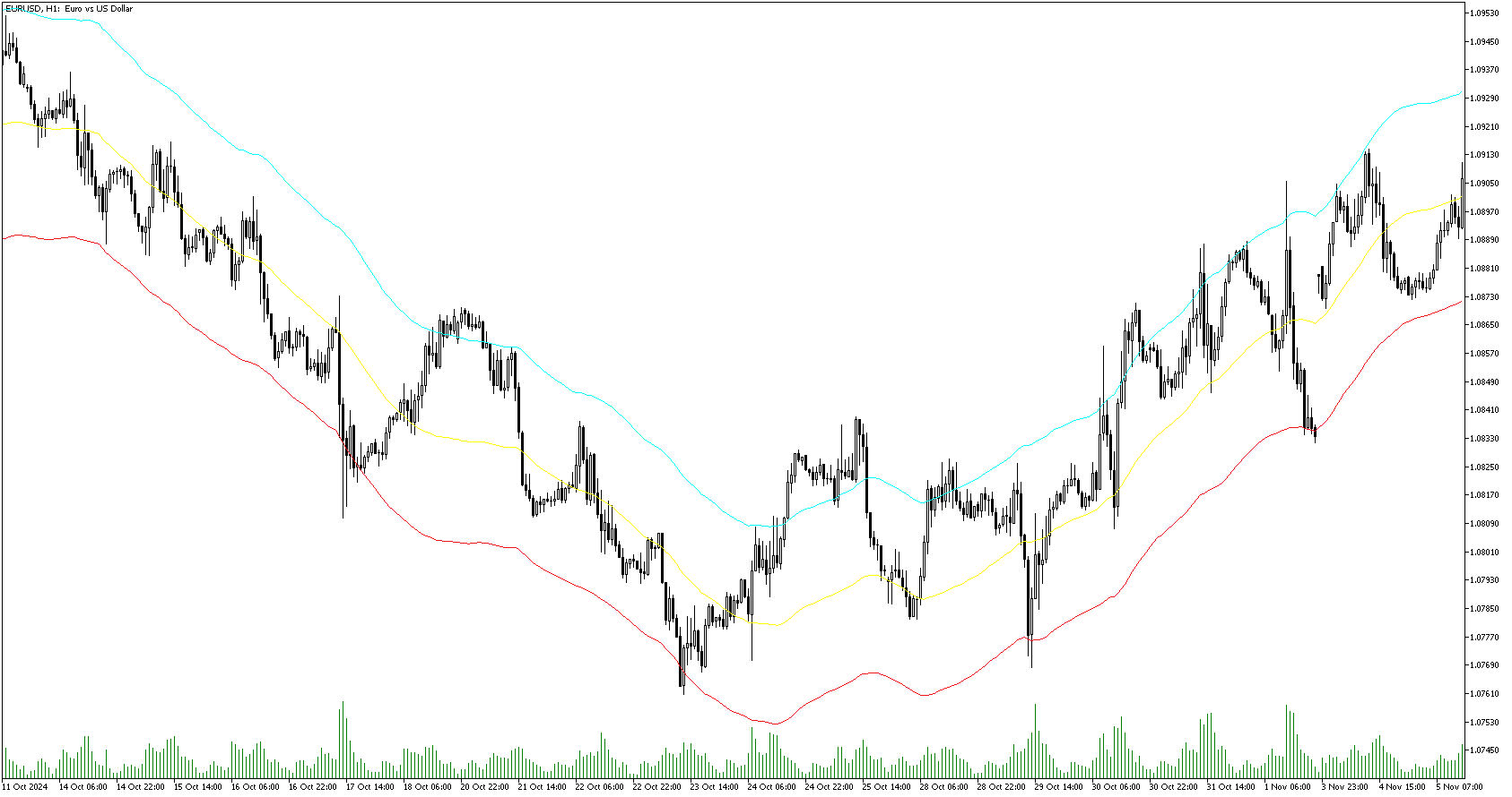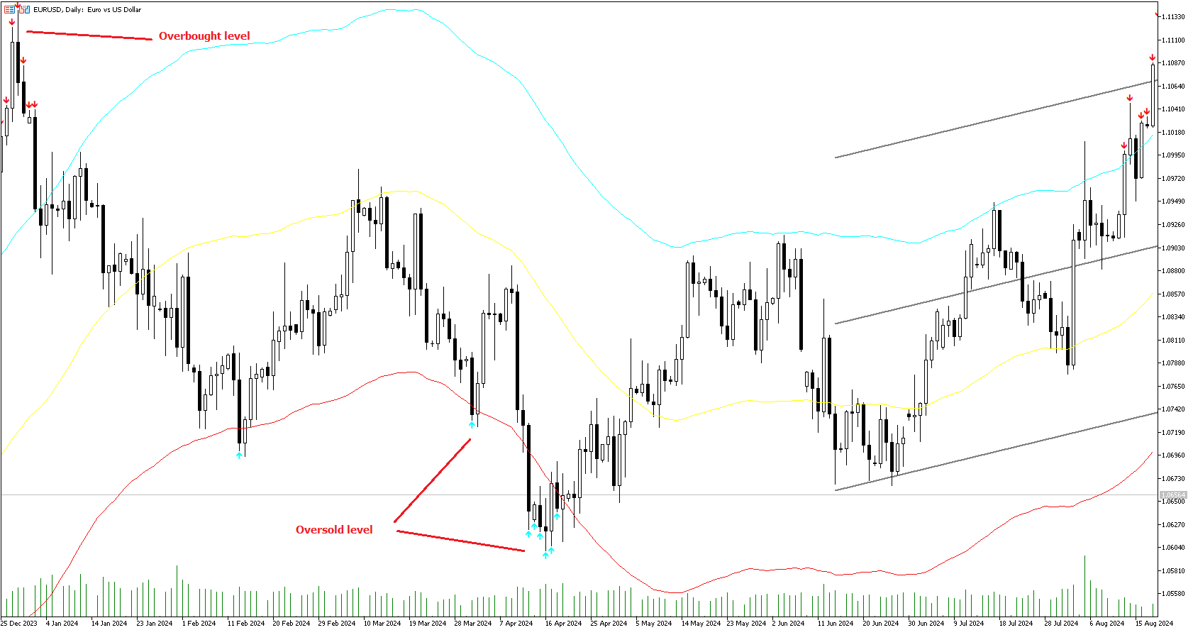 - 説明: バンドの外側で閉じたキャンドルに過剰売り、過剰買いの矢印を表示します。トレーダーはここで買い/売りを検討するかもしれませんが、他のインジケーター(例えばRSI)で確認する必要があります...
