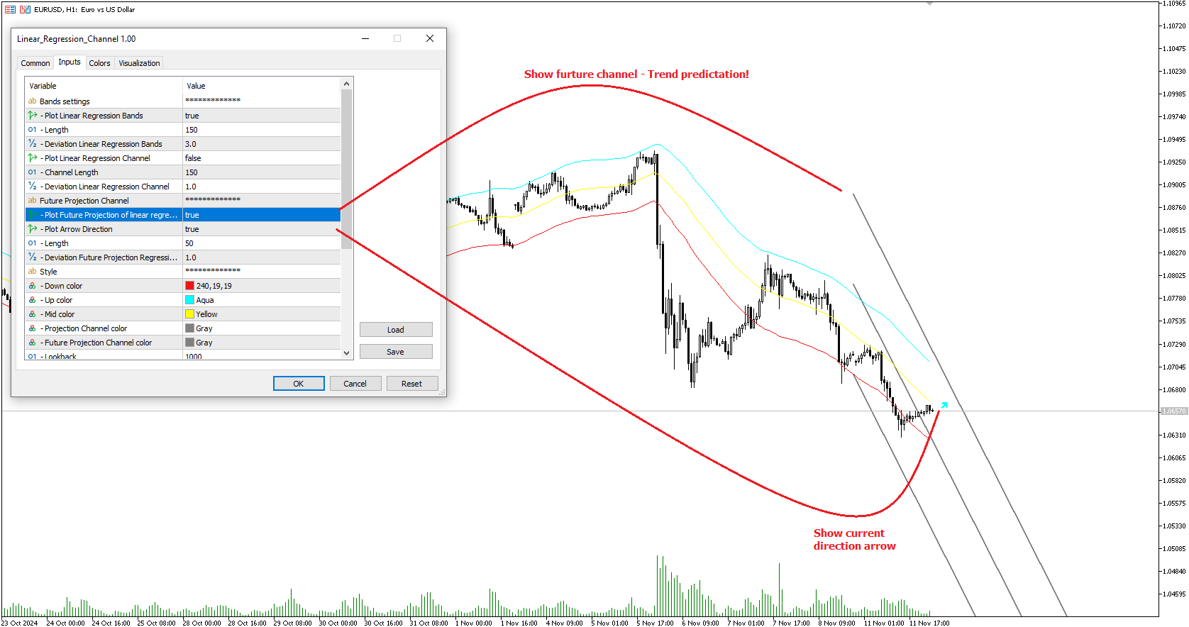 - 説明: 線形回帰チャネルを将来に投影し、潜在的な価格動向の予測を助けます。