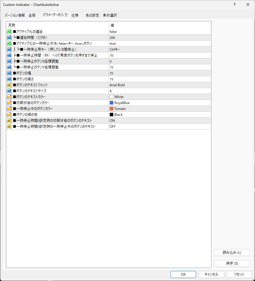 - アクティブ化の一時停止方法: false=キー, true=ボタン 一時停止させる方法の選択。falseは別項目で設定するキーを押して停止させる。trueはチャート上にボタンを表示させてそのボタンで停止させる。