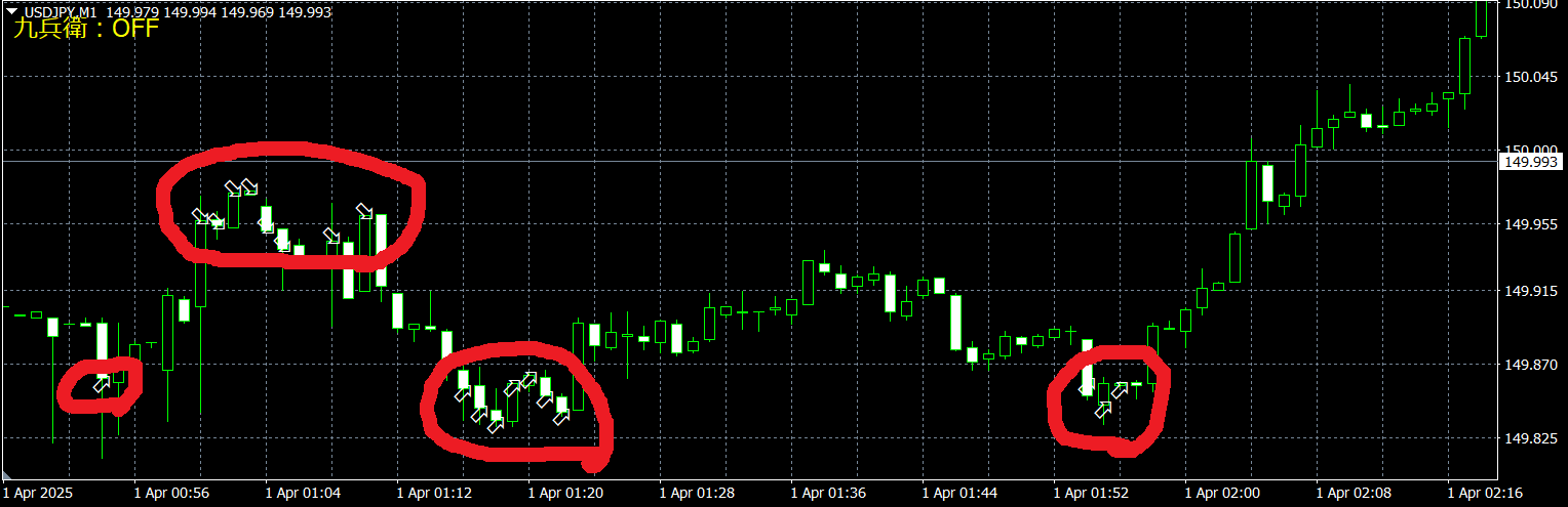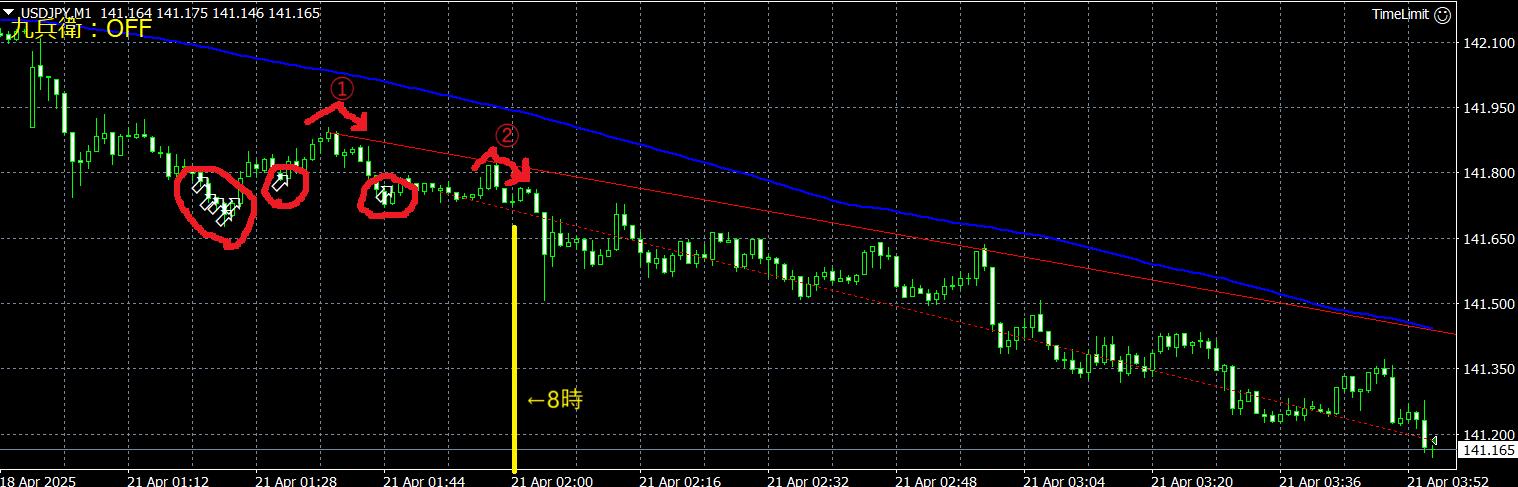 なお、九兵衛インジケーターは朝の相場の流れが発生する前に勝てるロジックを搭載しているため、朝一から相場の流れが一方に動いているときは負けます。例えばFOMCの発表後の朝とかは負けやすいです。