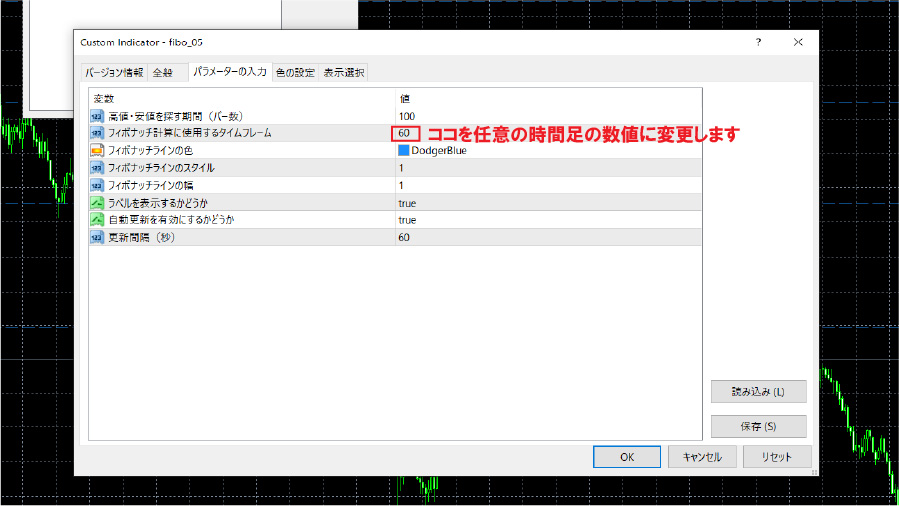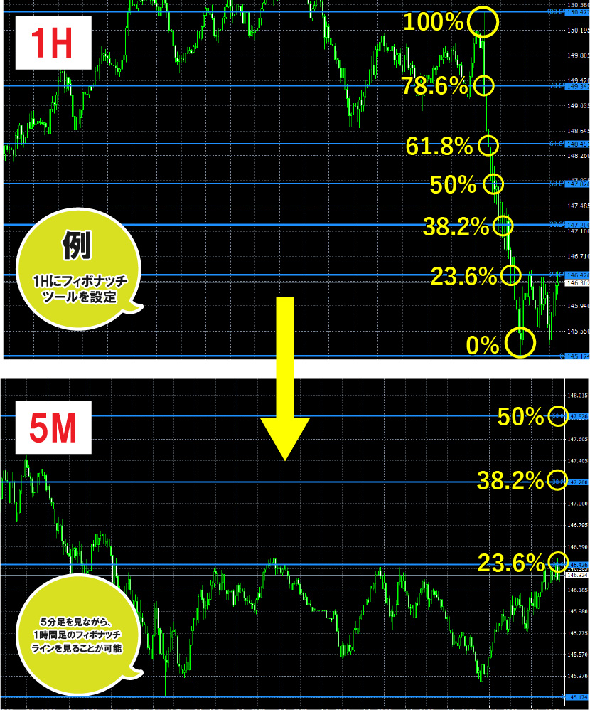 - 使い方: 任意の時間足のフィボナッチラインを見ながら、任意の時間足で押し目買い・戻り売りの最適なポイントを視覚的に把握できます(例:1時間足のフィボナッチラインを見ながら、5分足でトレード)