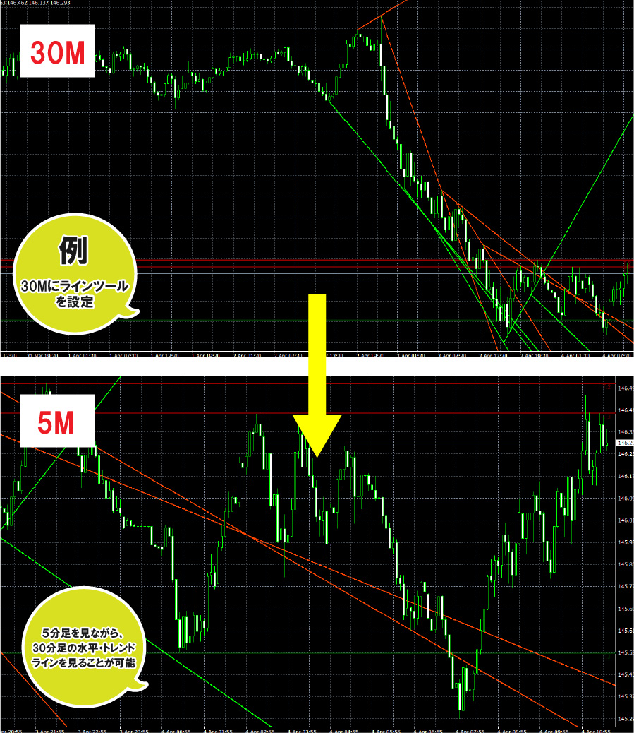 - 使い方: 任意の時間足のラインを見ながら、任意の時間足で押し目買い・戻り売りの最適なポイントを視覚的に把握できます(例:1時間足の水平・トレンドラインを見ながら、5分足でトレード)