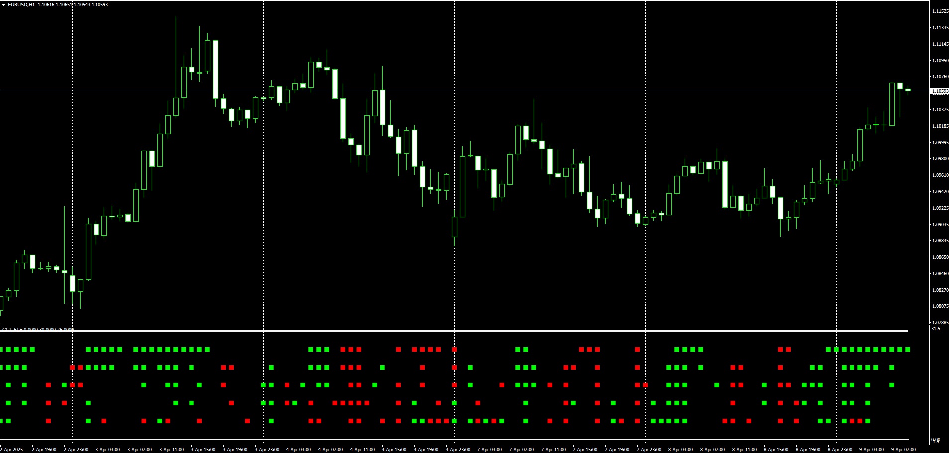 ■ 主な機能 複数の時間足(H1、M30、M15、M5、M1)におけるCCI(Commodity Channel Index)の状態をカラーで視覚化し、エントリー・エグジットの判断を補助します。