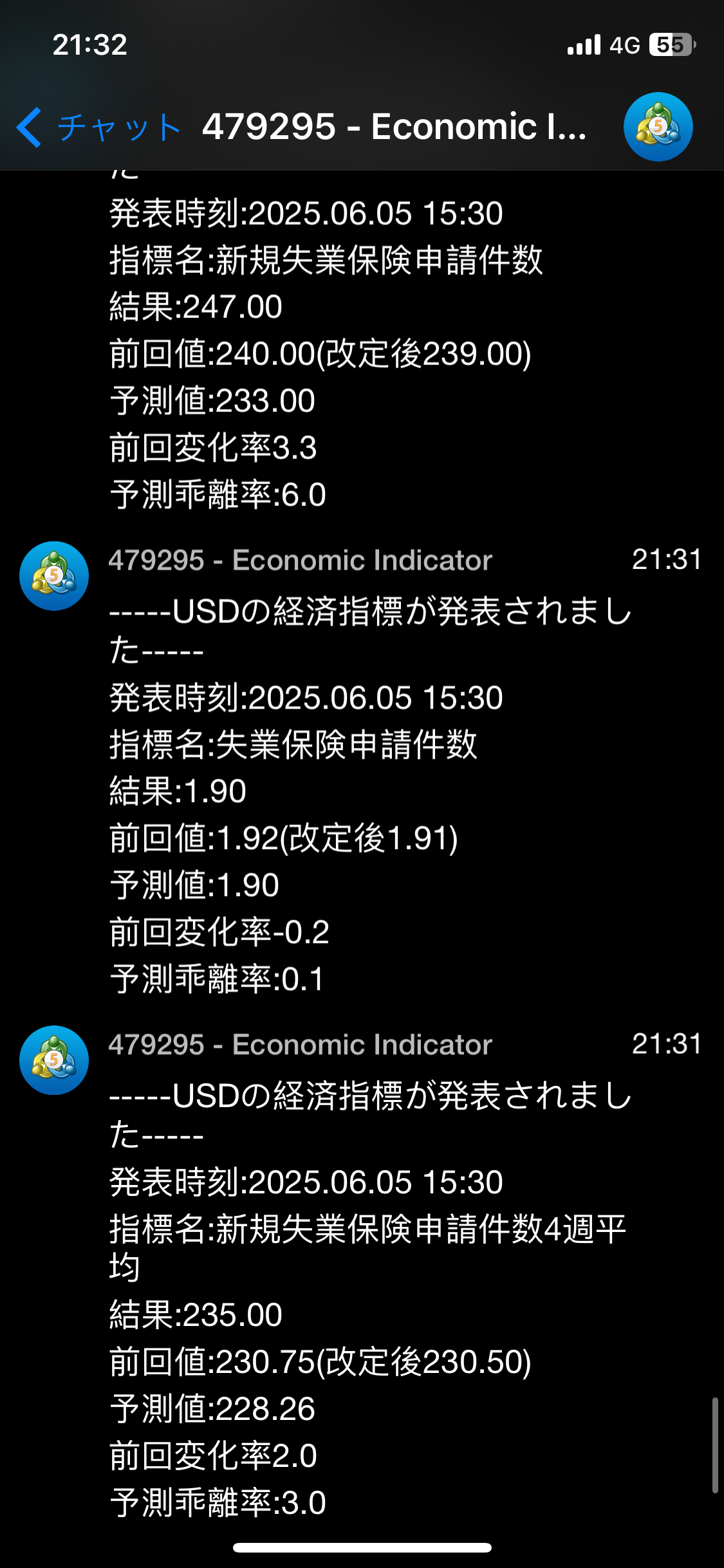 ③通知内容は「発表時刻・指標名・結果・前回値・予測値」のほか「前回変化率・予測乖離率」を計算して市場にどれくらいのインパクトがあるかを一目でわかりやすくなっています。