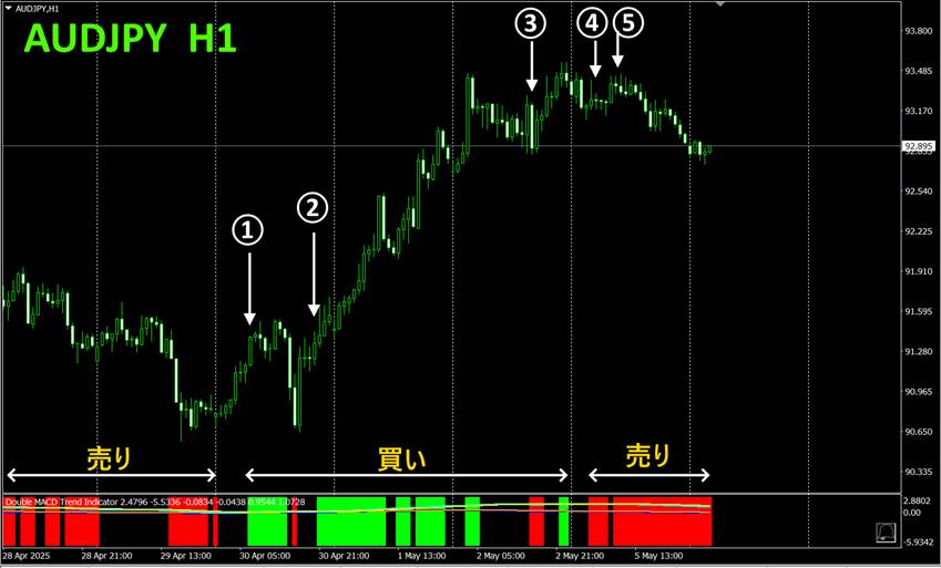④で、インジケータバーのカラーが、緑に変わり、①、②を超えてくるのであれば、絶好の買い場になります。上昇トレンドの初動を捉えることができます。