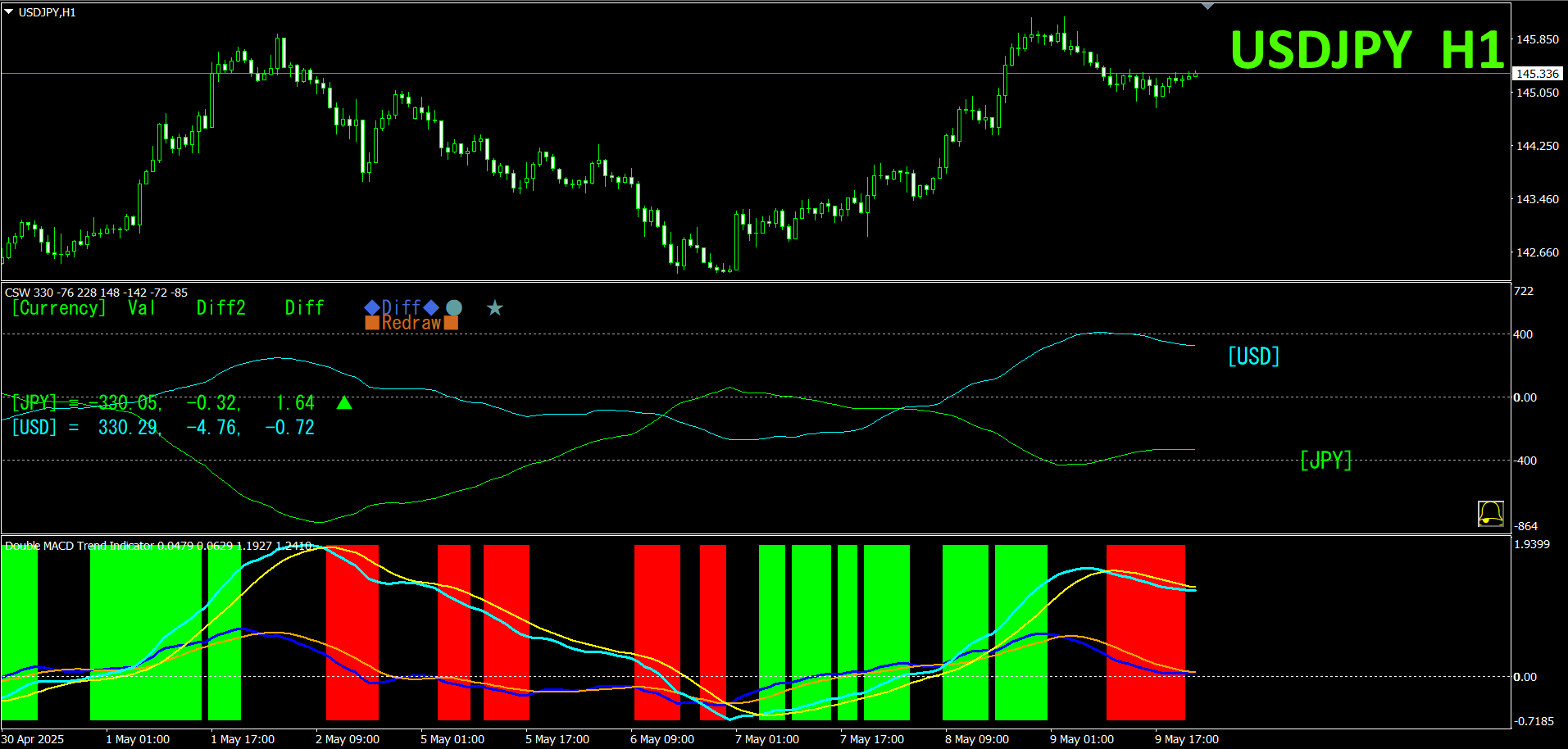 下の図は、「8C通貨強弱見える化インジケータ」と併用してみた事例です。USDJPYの1時間足チャートで、上から順番に、ローソク足チャート、「8C通貨強弱見える化インジケータ」、「Dual MACD Trend Indicator」と並んでいます。