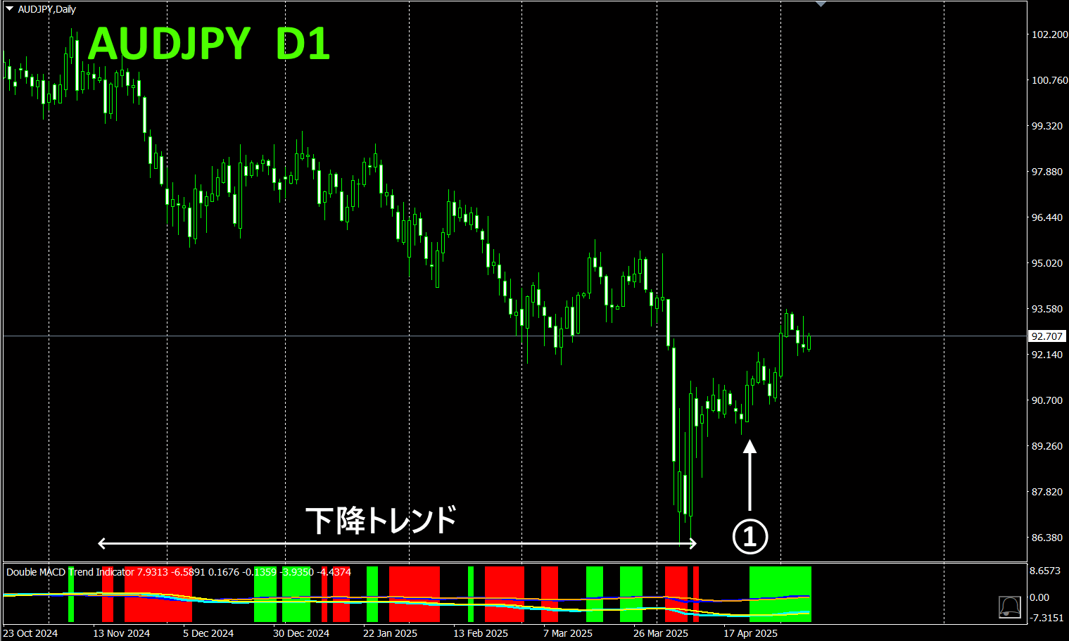 ①は、赤色のバーが長く続いていたのが、途切れてから、緑色に変わったポイントです。下降トレンドからトレンド反転し、上昇トレンドに変わった場所なので、絶好の買いエントリーポイントになります。ローソク足チャートを見ても、ダブルボトム(逆三尊)が出現しています。