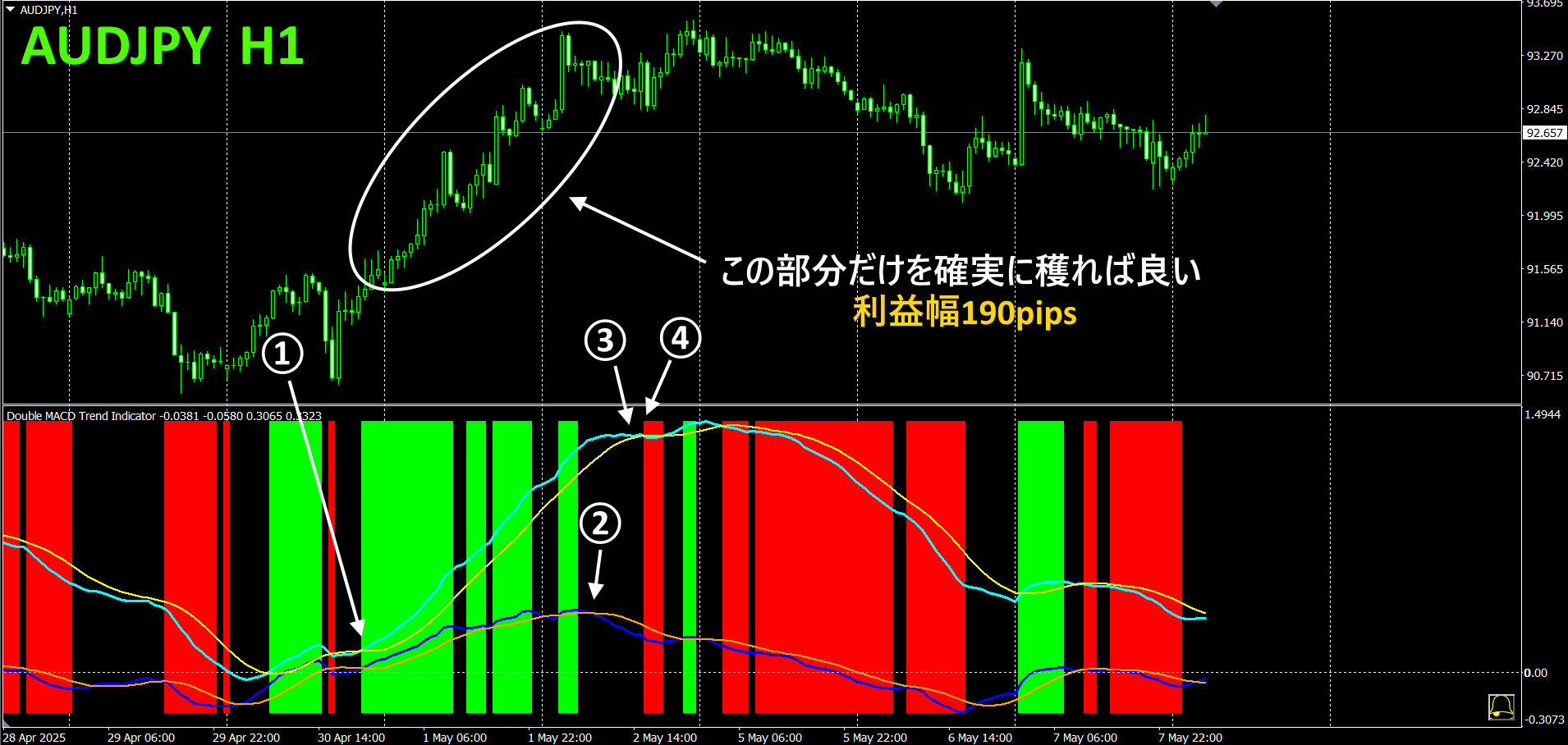 ①から④まで、売りポジションを保有して決済した場合、約260pipsの利益が得られます。はっきりと下落しているところだけにフォーカスして、確実に穫るという使い方ができるのも、このインジケータの特徴になります。