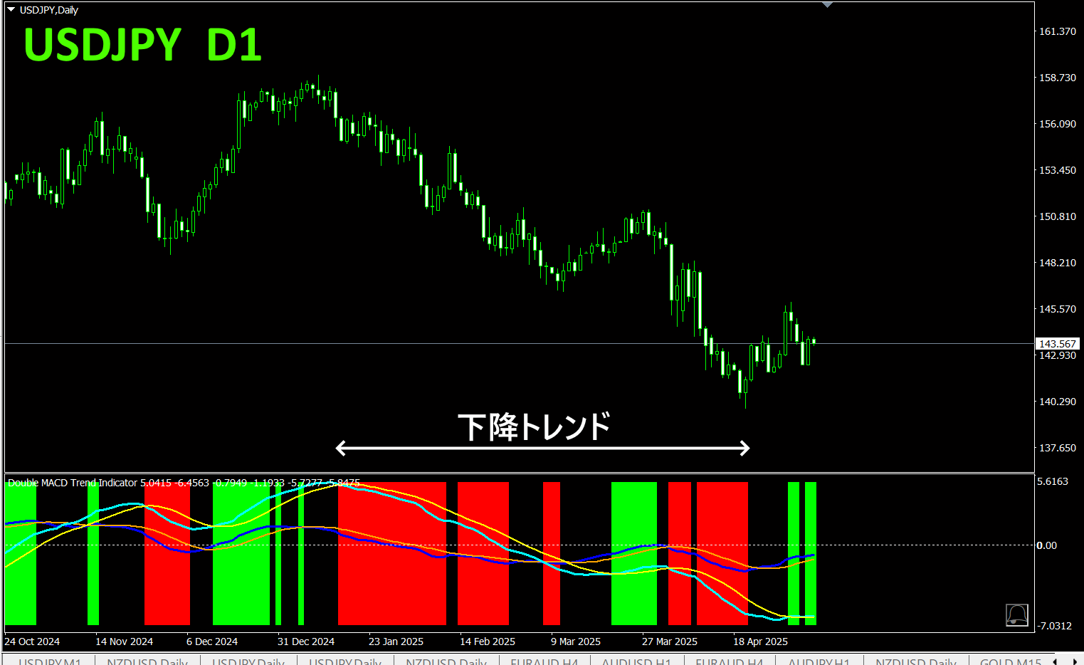 日足レベルで下降トレンドになってきていることが、インジケータの色から読み取れます。