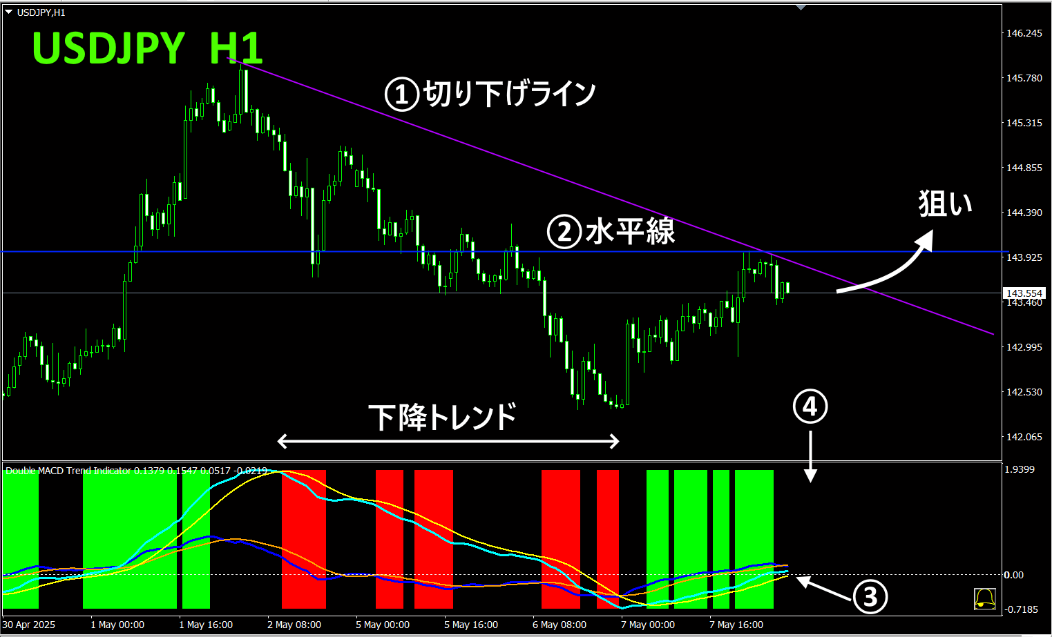 ①の切り下げライン(紫色の斜線)を引いておき、これを上抜けしてくるところを狙う。