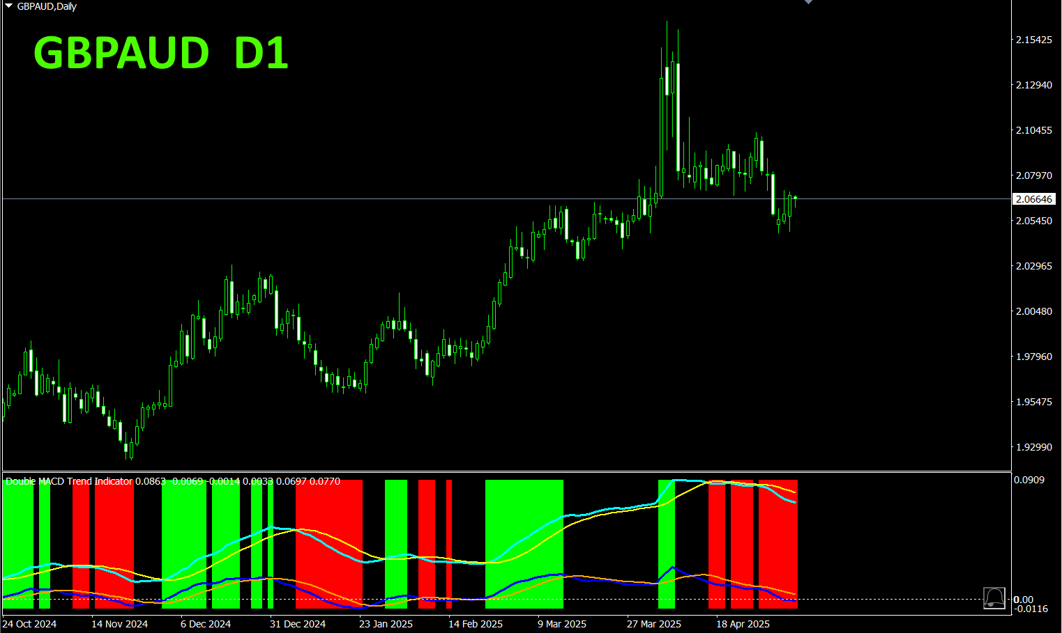 GBPAUDの日足では、インジケータの直近部分のカラーが赤色になっています。