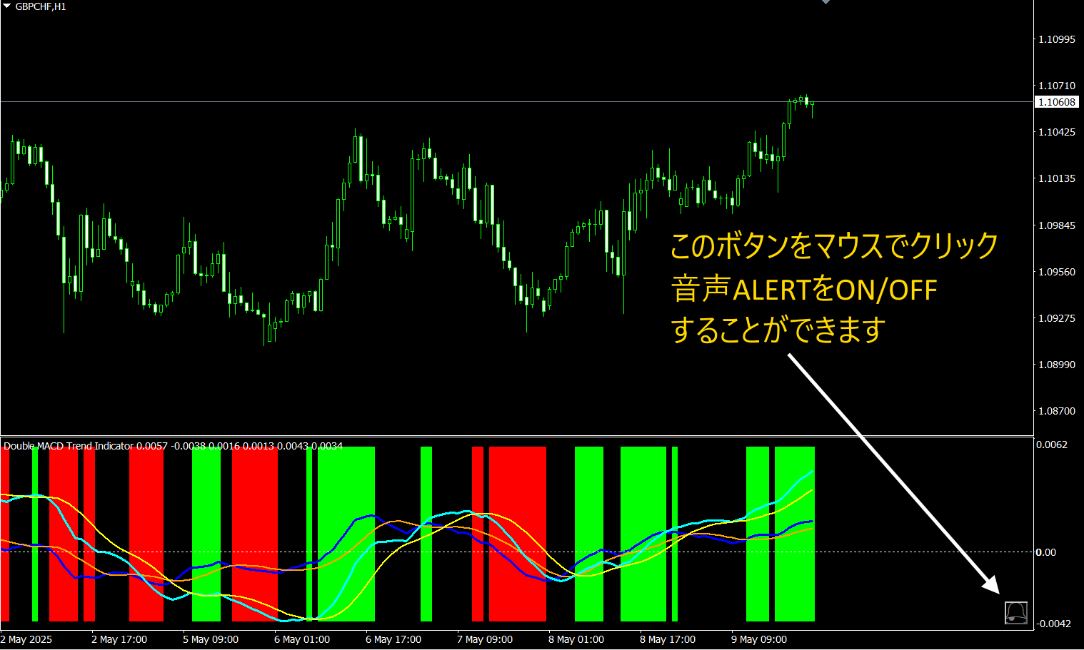 チャート上に「ベルアイコン」で表示されるボタンを作成し、クリックすることでサウンド通知のON/OFFを切り替えることができます。