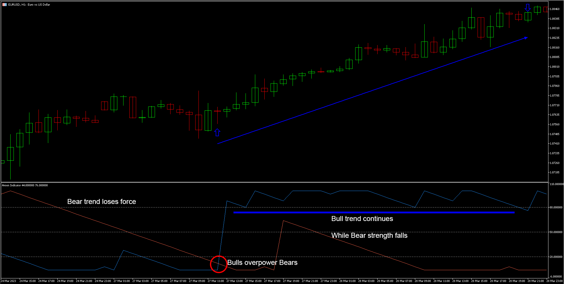 アローンアップ > 70 + アローンダウン < 30 = 強い上昇トレンド