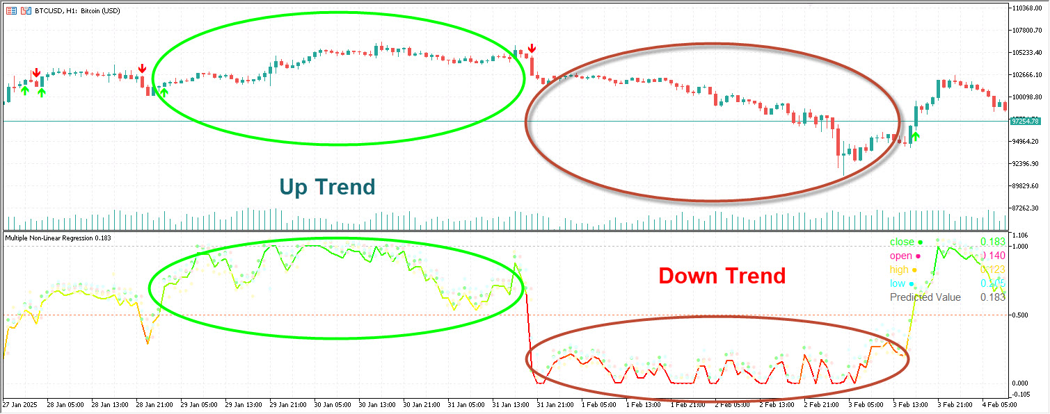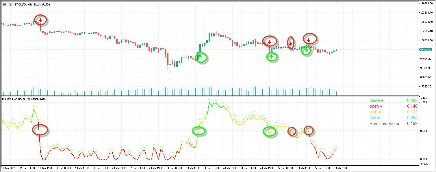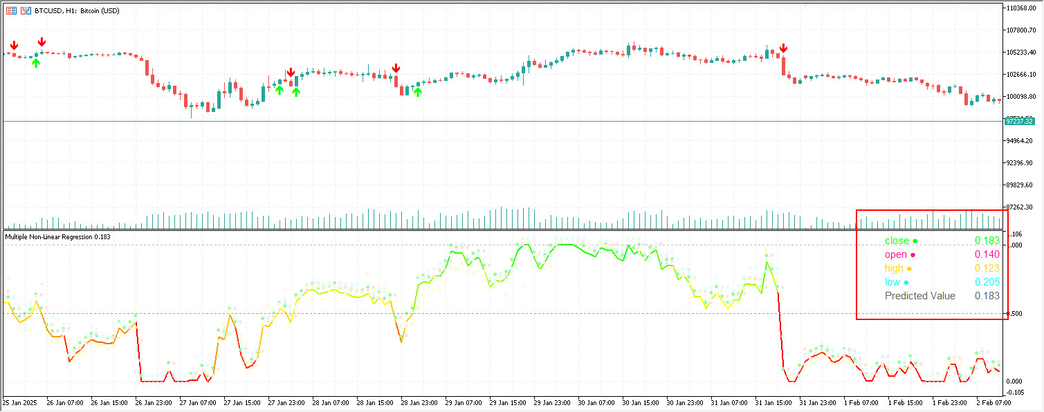 このインジケーターは、終値、始値、高値、安値の4つの独立変数を使用して、複数の非線形回帰分析を実行するように設計されています。