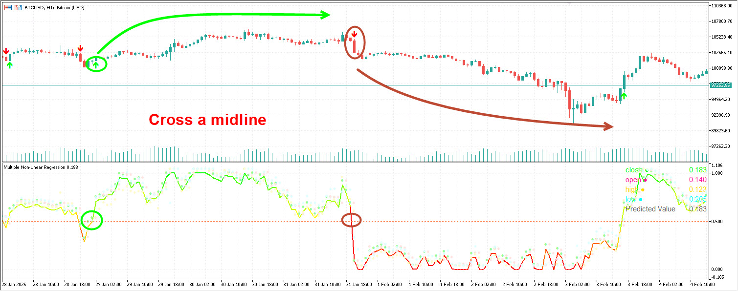 ユーザーは、回帰線と中間線(0.5)とのクロスオーバーを潜在的な買いまたは売りの機会のシグナルとして解釈できます。
