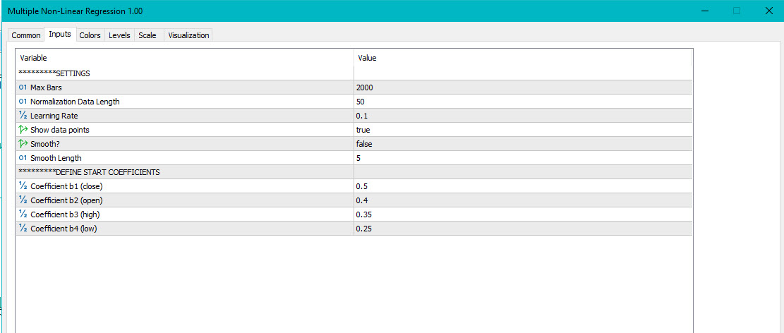 このインジケーターは、ユーザーが複数の変数間の関係を分析し、回帰分析に基づいて取引の意思決定を行うのに役立ちます。係数やパラメータを調整することで、特定の市場条件に応じてモデルのパフォーマンスを微調整できます。