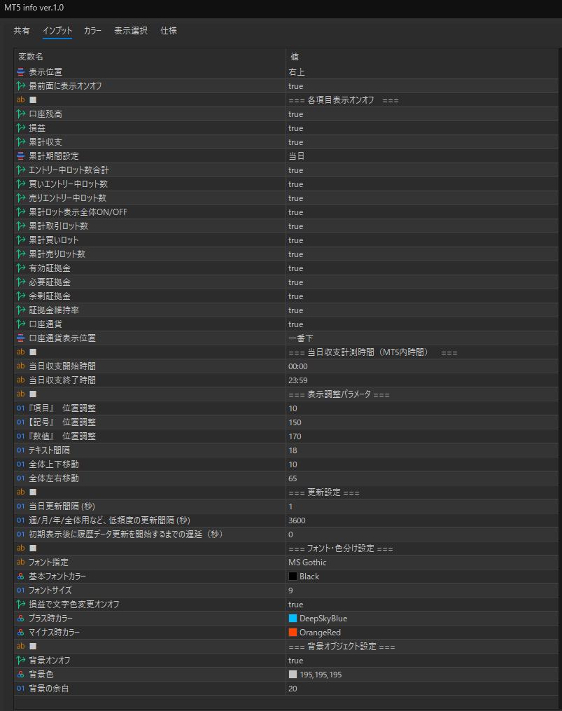 フォントと背景の色変更、損益と累計損益の項目はプラスマイナスで色変更可能。