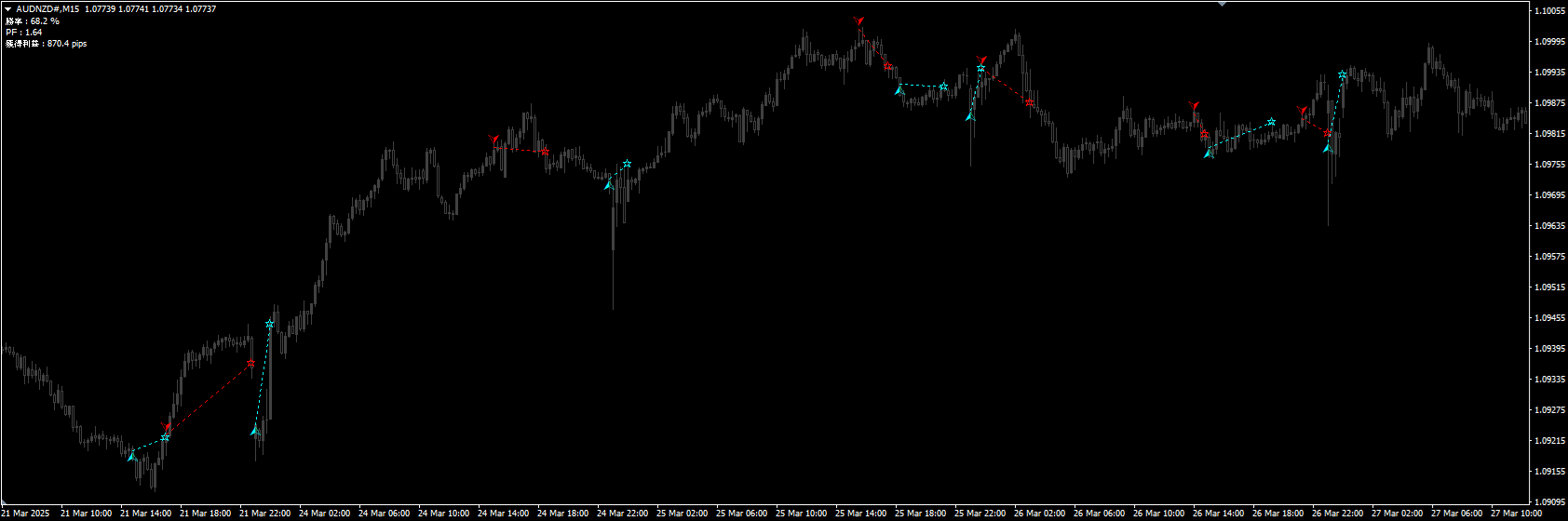実際の表示イメージ:AUDNZD M15 (水色:買いトレード / 赤色:売りトレード)