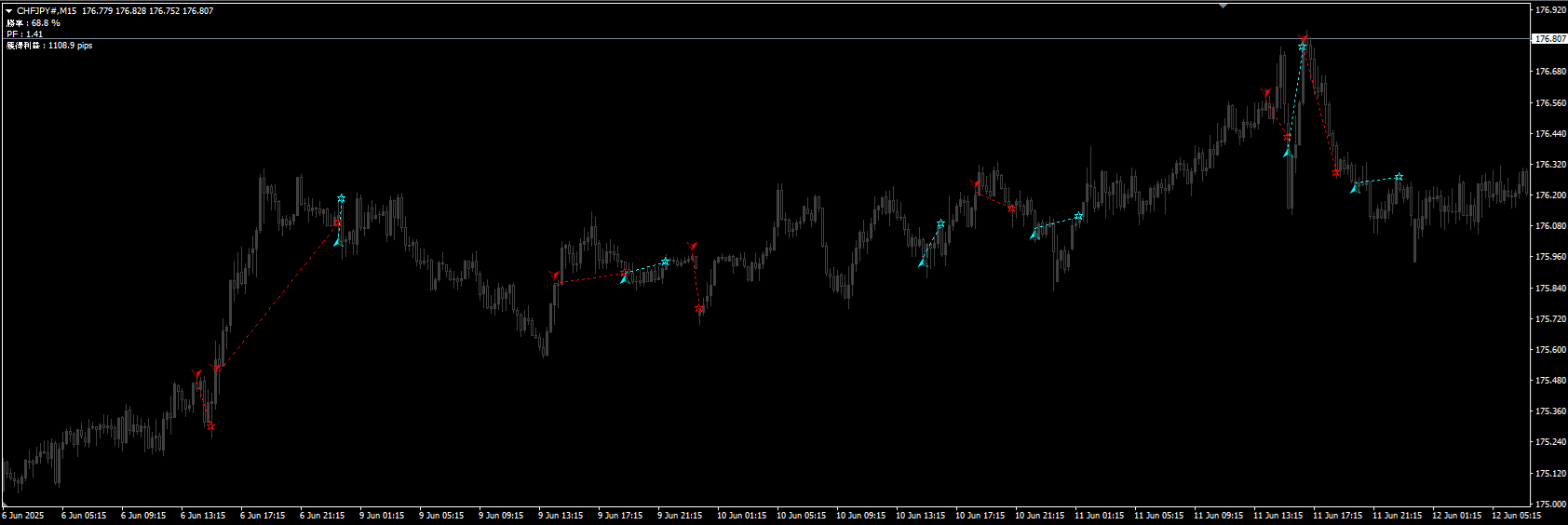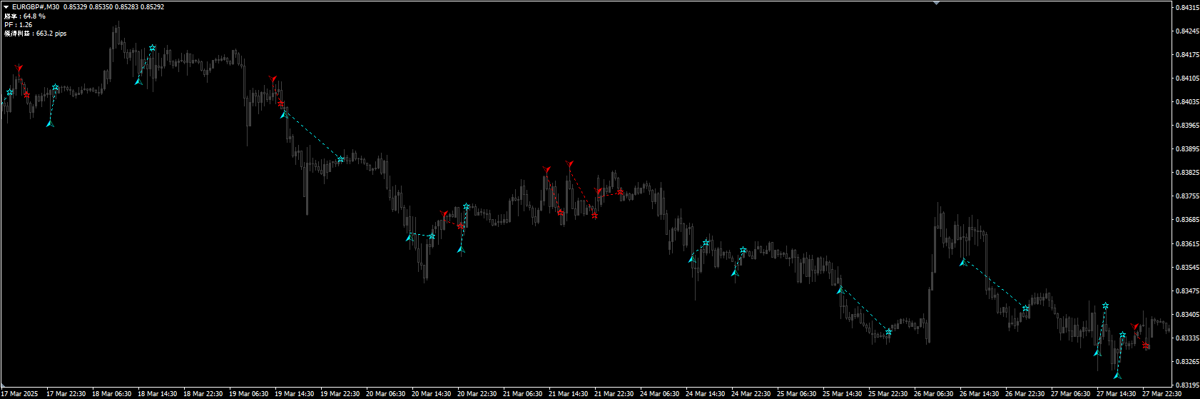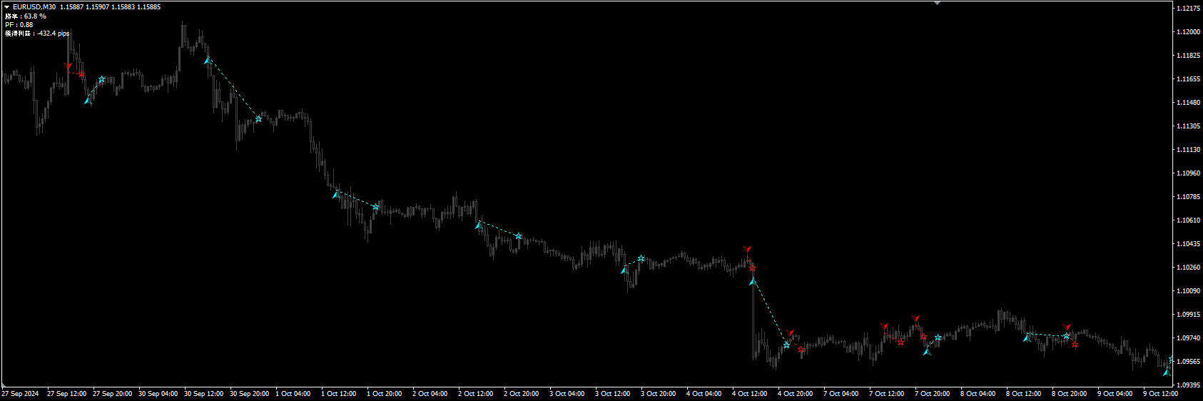 ・時間足:プログラム内部で定義、M1~H1まで表示可能(どのスケールでもサイン出現のタイミングは一緒です)