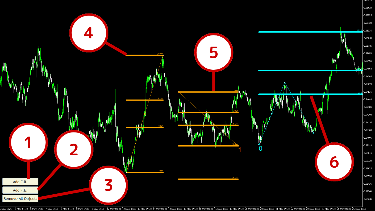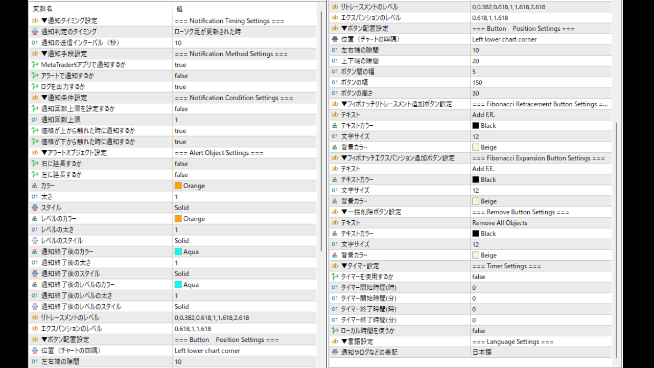 価格がフィボナッチリトレースメント/フィボナッチエクスパンションに到達したら「MetaTrader5」アプリに通知を送るインジケーターです。チャート上のボタンを押して自由にフィボナッチリトレースメント/フィボナッチエクスパンションを追加・削除できます。また、フィボナッチリトレースメント/フィボナッチエクスパンションごとに通知上限回数を設定することができます。自動売買の機能はないため、トレード補助のツールとしてお使いください。