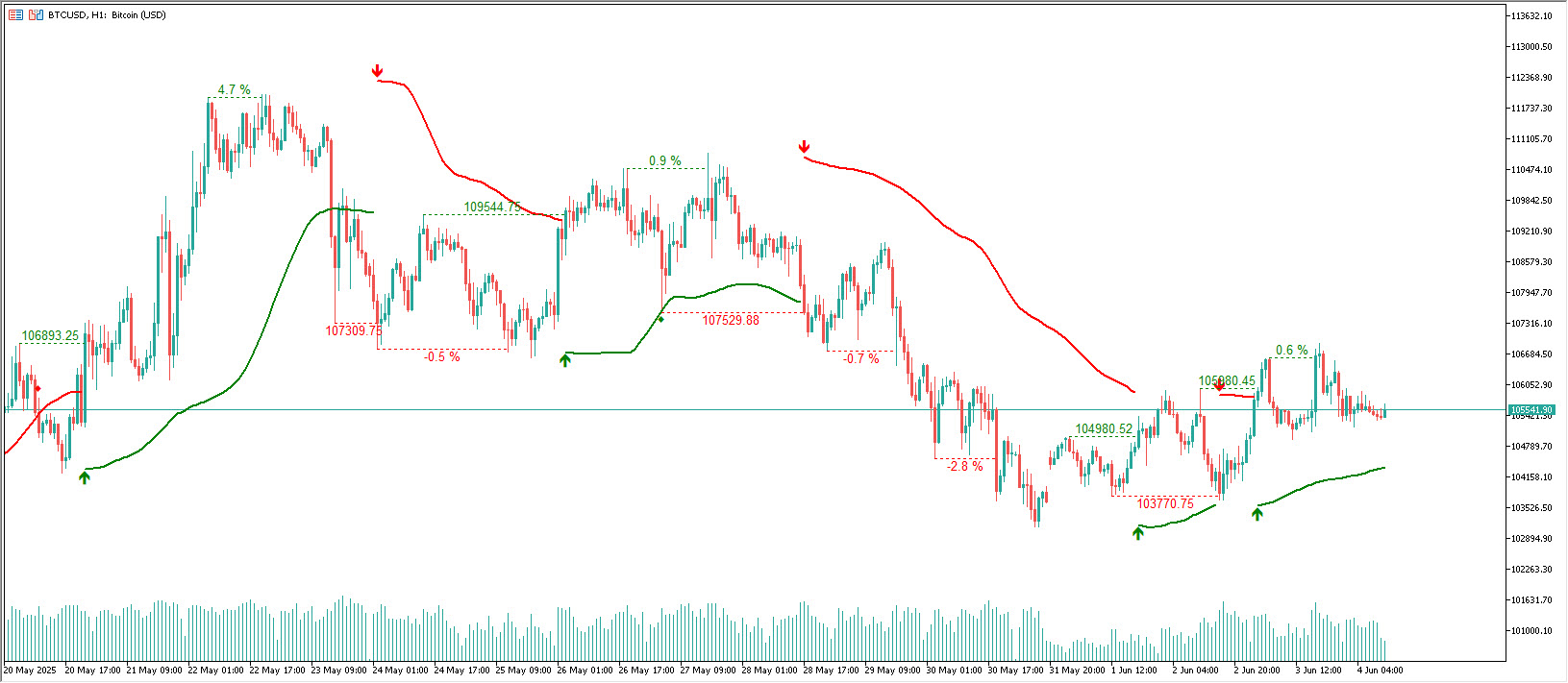 各ブレイクアウトポイントから価格がどれだけ動いたかを正確に確認できるパーセンテージ変化ラベルを使用します。これにより、市場の強さ、ボラティリティ、潜在的な疲労感をリアルタイムで把握でき、動きがまだ続くか、限界に近づいているかを判断するのに役立ちます。