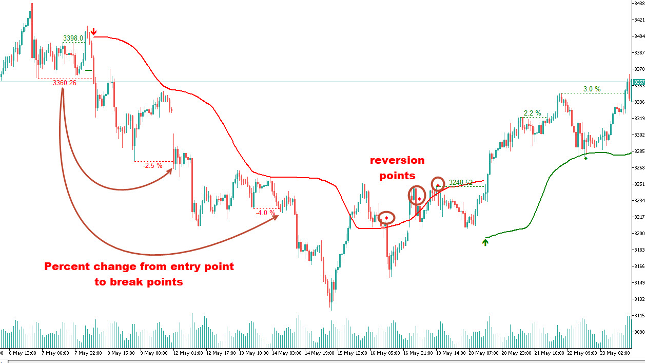 このインジケーターは、ダイヤモンドアイコンで潜在的な平均回帰ポイントを特定します。上昇トレンドでは、価格がストップロスを下回り、その後再び上回ると、ダイヤモンドがプロットされ、平均回帰の可能性を示唆します。同様に、下降トレンドでは、価格がストップロスを上回り、その後再び下回ると、リバージョンの可能性を示します。