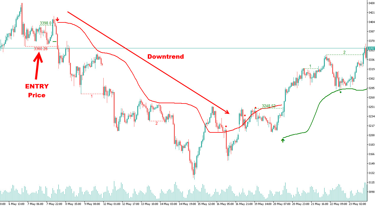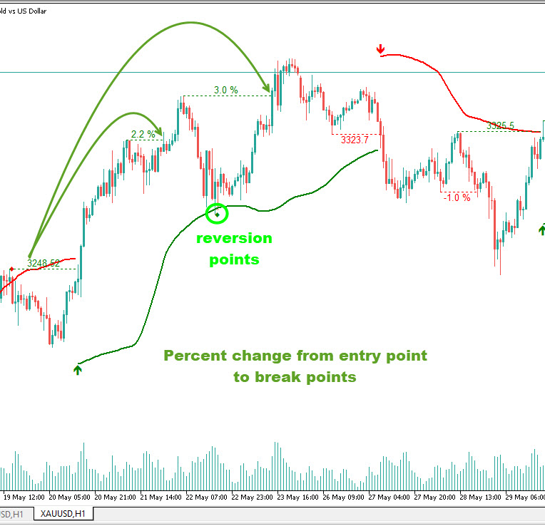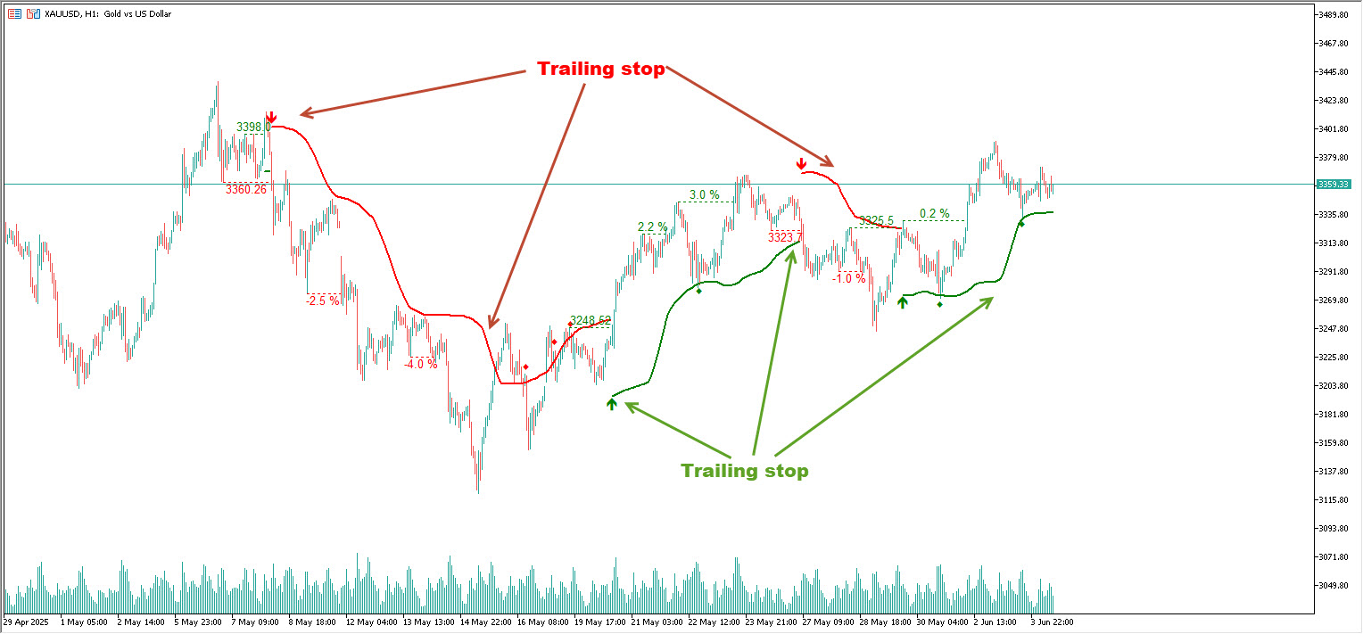 このインジケーターは、最近の構造的ピボット、ブレイクアウト確認、ボラティリティに基づいて動的なストップロスレベルを自動計算します。これらのスマートレベルは価格が動くにつれて調整され、トレーダーがリスクを精密に管理しながらトレンドを追跡するのを助けます。価格がストップロスレベルを突破した場合、インジケーターはトレンドの潜在的な終了または反転を示すポイントを表示します。