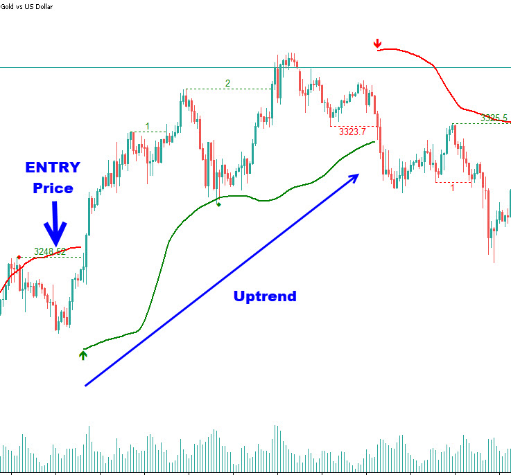 重要な構造的ブレイクアウトを連続番号付きマーカーで追跡し、価格アクションの進行を視覚的にフォローするのに役立ちます。市場が上昇トレンドにあるか下降トレンドにあるかにかかわらず、各ブレイクアウトポイントは記録され、構造の変化の確認と簡単な遡りのために表示されます。最初のブレイクアウト(ゼロブレイク)はエントリープライスと矢印アイコンでマークされ、トレンド内のその後のブレイクアウトはトレンドの継続を示すために連続的に番号付けされます(1, 2, 3ⅆ)。