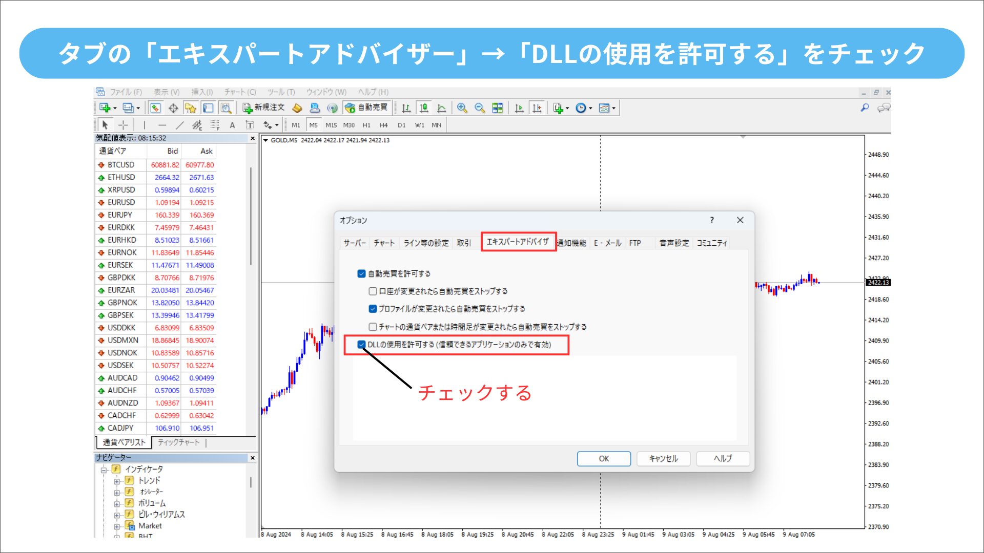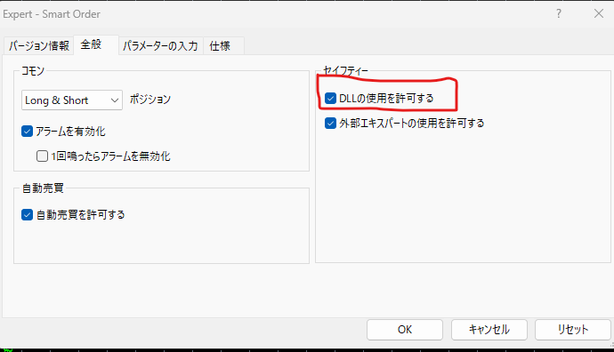 許可はEAをチャートのセットしたときに表示される設定画面で簡単にできます。