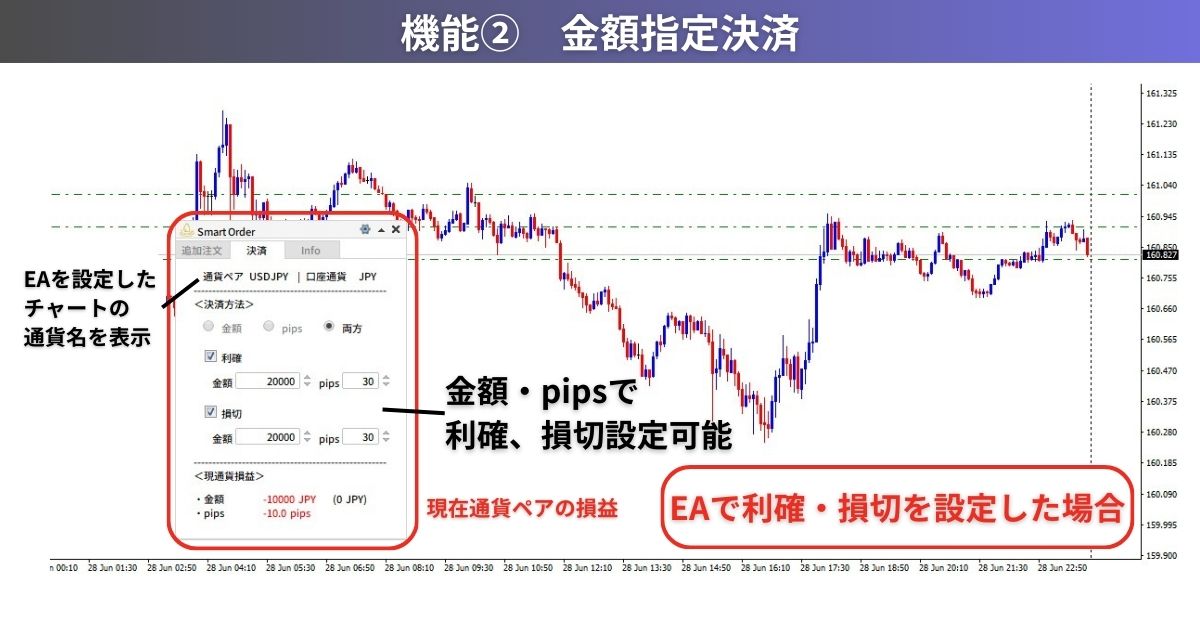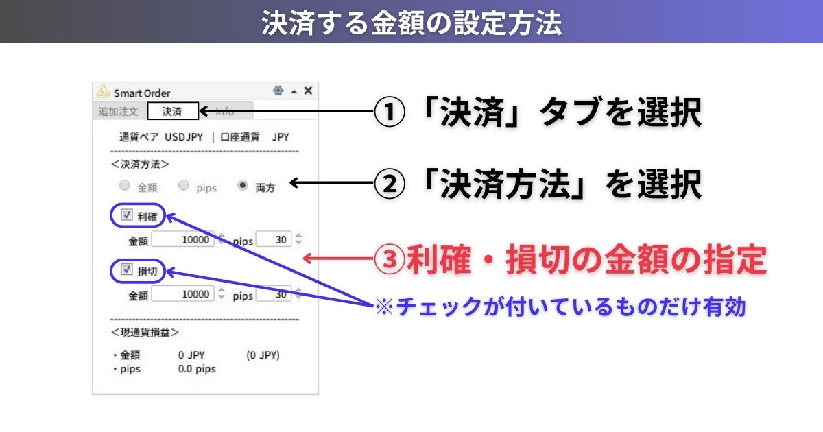 金額決済と同様、事前に設定したpipsを超えたら利確・損切の決済を自動で行います。