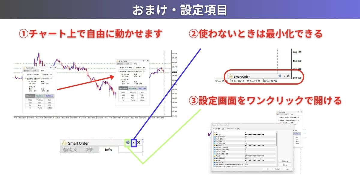 本ツールは、チャート上で自由に動かせたり、最小化できるなどトレーダーにとって使いやすいように設計しております。