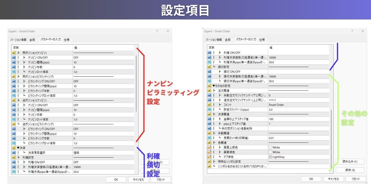 これにより、ナンピンやピラミッディングしたポジションが追加された場合でも、利確と損切の値幅を限定することができ、安心してトレードできます。