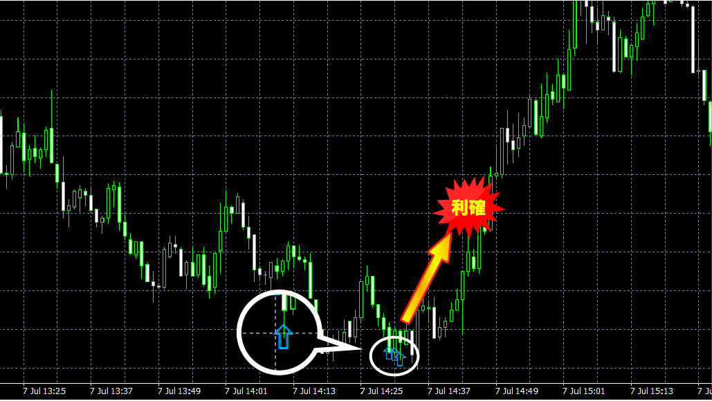 ※実際のチャートです。このように、エントリーチャンスが近づくと矢印とアラートでお知らせします