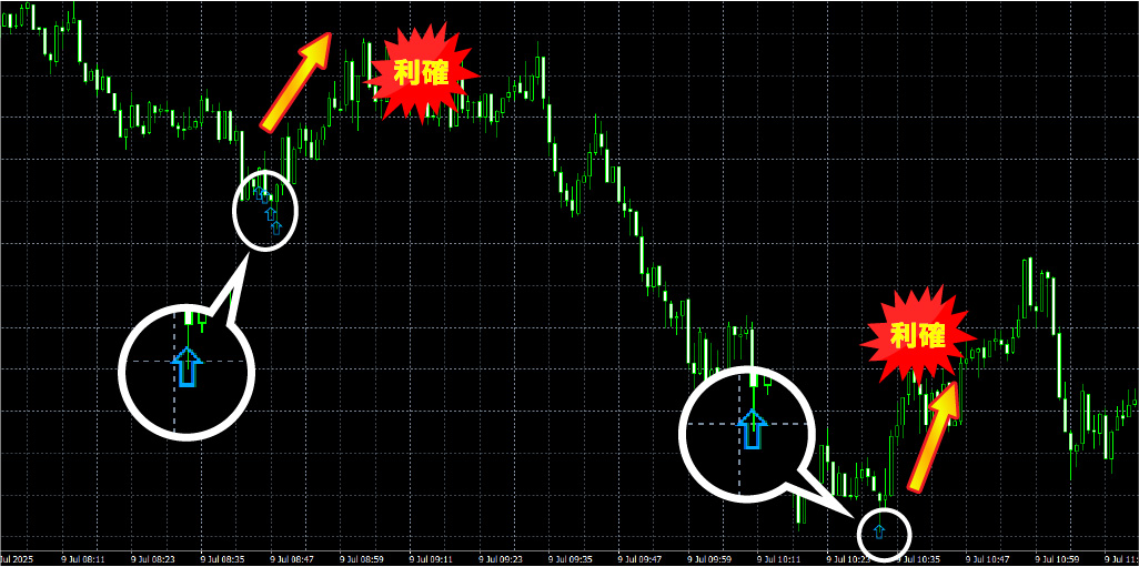 特に、1分足~15分足などの短期足を使ったスキャルピングで効果を発揮しやすいのが大きな特徴です。