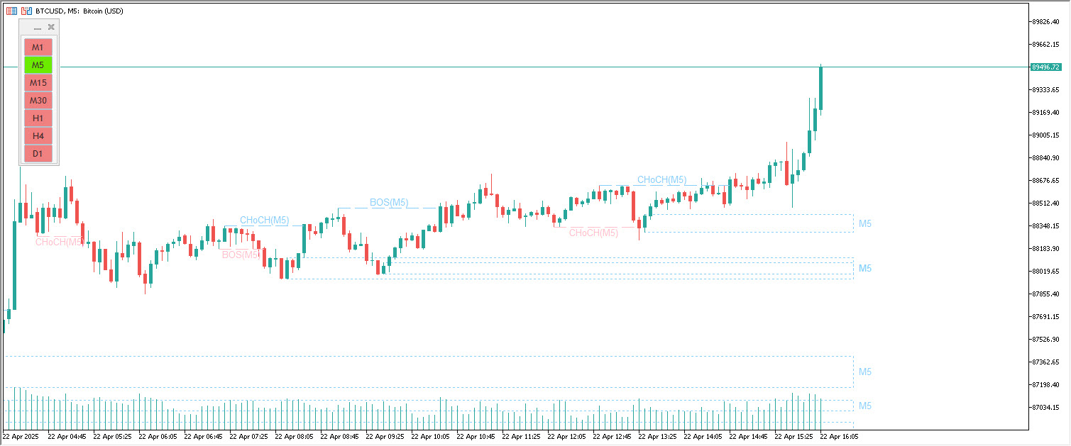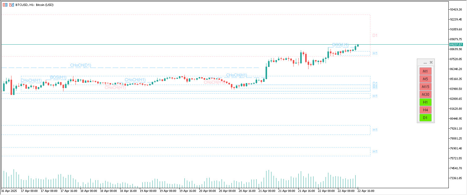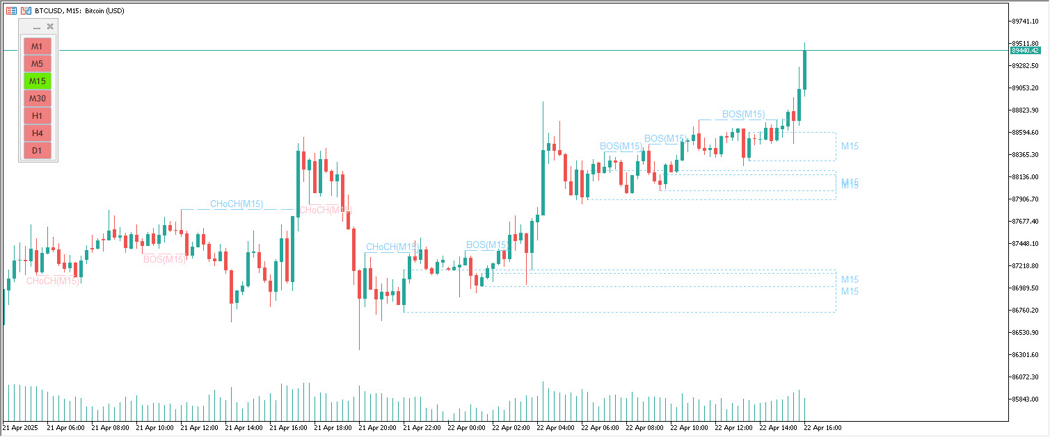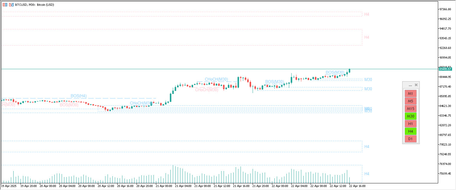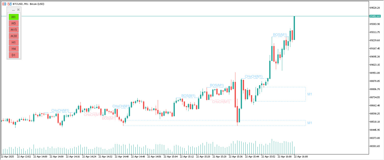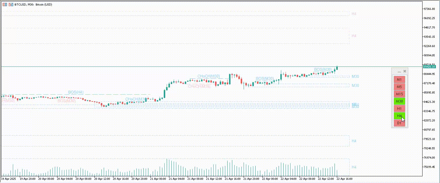 H1、H4、日足、その他の高いタイムフレームのOBをアクティブチャートで表示し、全体像を一目で把握できます。構造のブレイク(BOS)&キャラクターの変化(CHoCH)