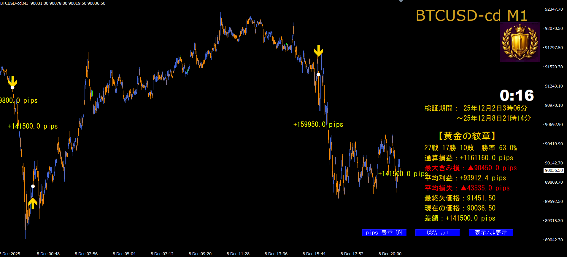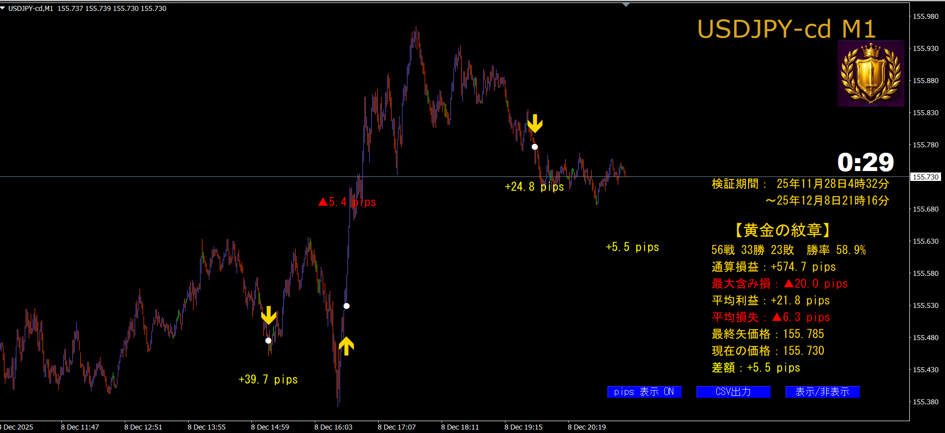 今まで提供してきたものも、少し工夫をすれば利益を得られるもので、感謝の言葉を頂いたことも多くあります。しかし、もっとできるはずだ、きっとできるはずだという思いが強く、挑戦を続けてきました。その結果、やっと、やっとですが、これならというものが出来上がりました。このシステムも、発売当初から初めて利益が出るようになったという好意的なご意見を多くいただきましたが、率直に言って、まだまだ不満でした。こんなものじゃないという思いが頭から離れませんでした。 で、その壁を越えられず、発売以降も挑戦を続けていましたが、それがつい最近、ほんの1週間ほど前ですが、ストンと腑に落ちたのです。ああ、そうだったのかという思いがこみ上げてきました。計算上安定して60%前後の勝率が出るもの、当然それに伴った利益が期待できるものです。それも、特定の通貨ペアや特定の時間足ではなく、安定してあらゆる局面で、成果が出せるものがやっと出来上がったと思っています。その切っ掛けは、別売の「煌光の黄金境」の開発です。そこで得た知見、技術をこのシステムにフィードバックしたところ、素晴らしいものが出来上がったのです。
