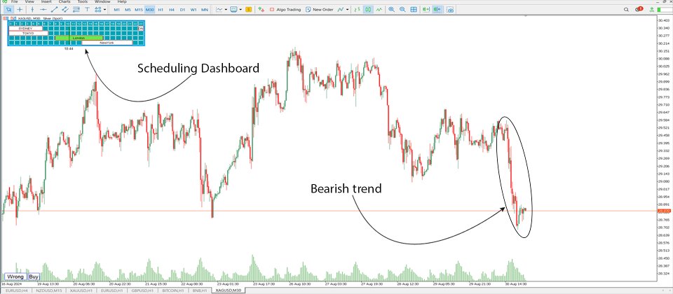 30分足のXAG/USD(シルバー)チャートでは、ロンドンセッションボックス内で下降トレンドが発生しています。インジケーターは、セッション活動に合わせた時間特有のパターン(ボリュームスパイク、流動性スイープ、ブレイクアウトなど)を特定しやすくします。
