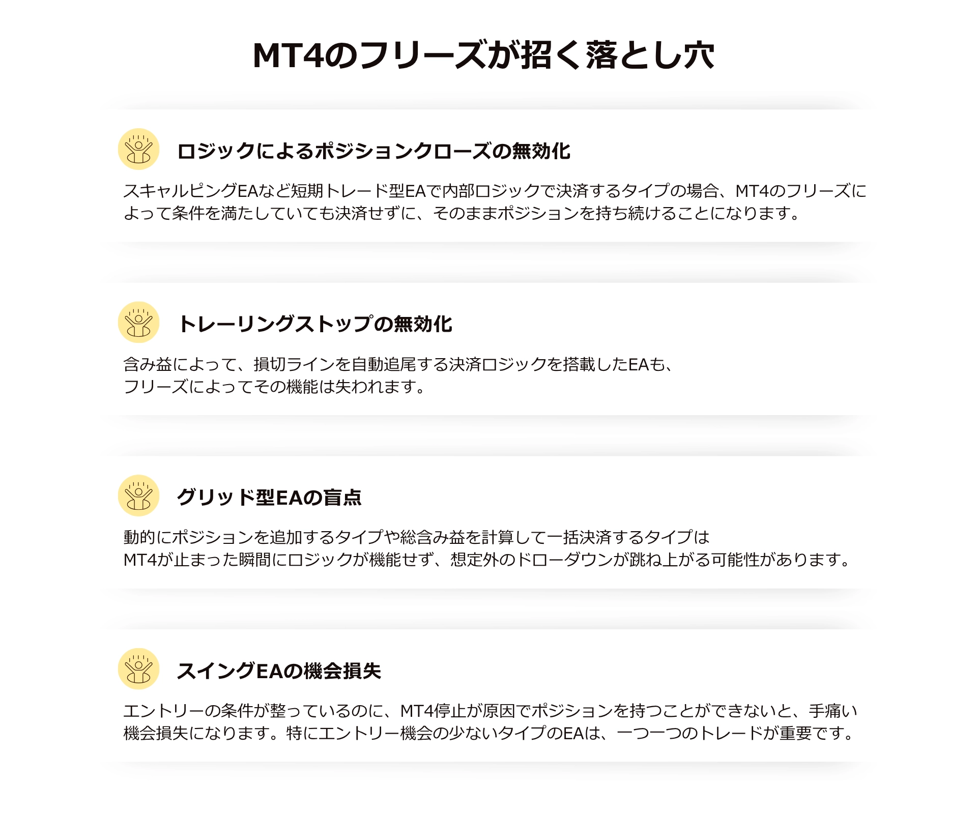 「深夜の急騰で決済されるはずのポジションが、フリーズで放置され朝にはロスカット…」