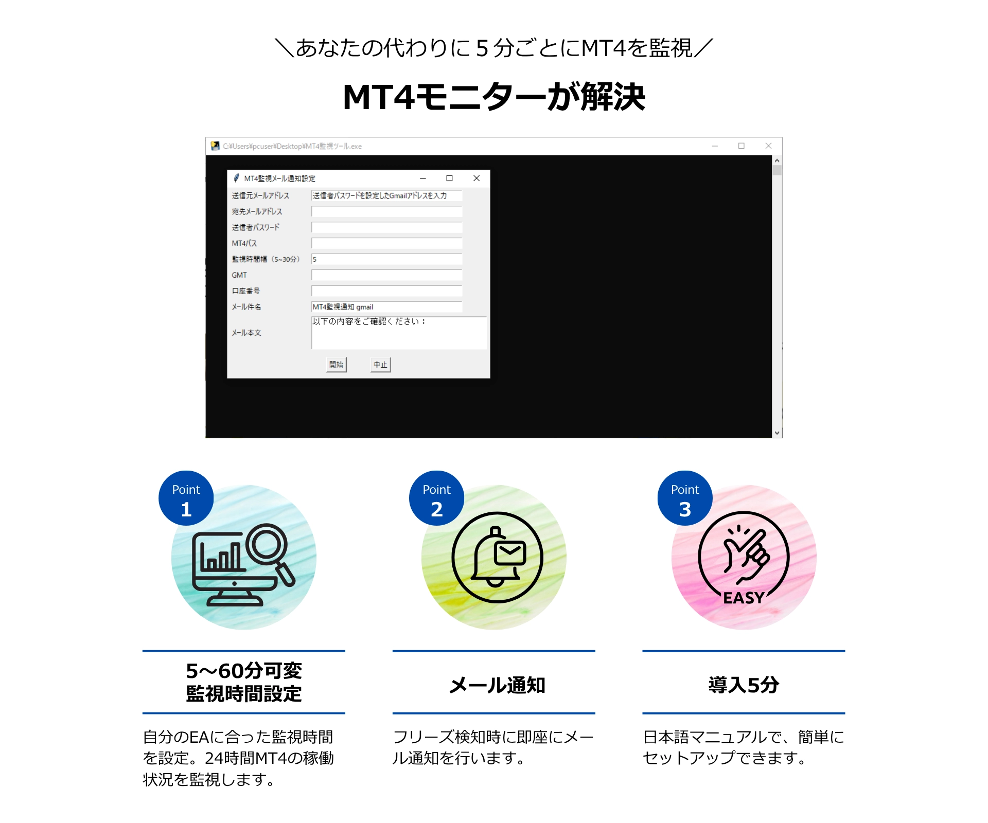 テスト用【MT4動作監視ツール】EA運用者必携!MT4のフリーズを最速検知&メールで即通知。【MT4モニター】