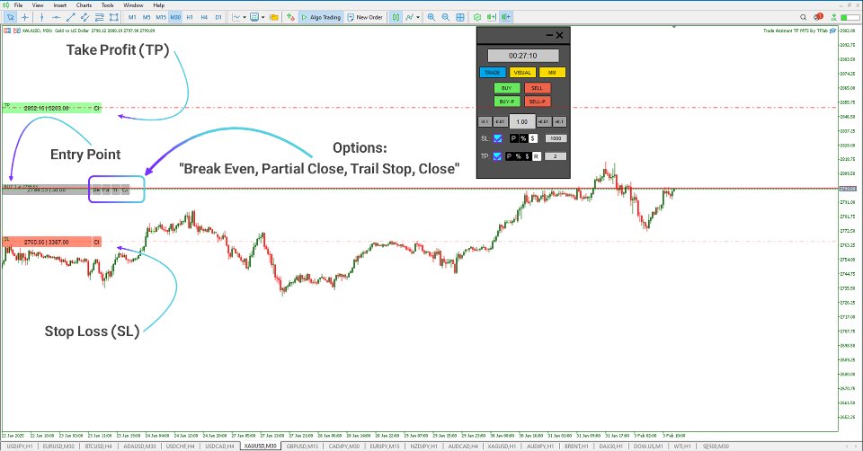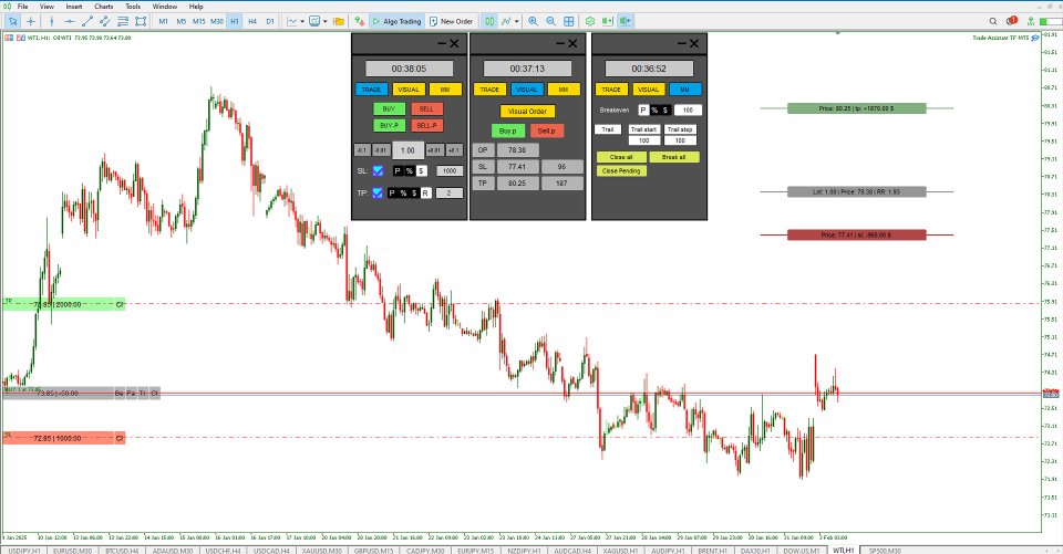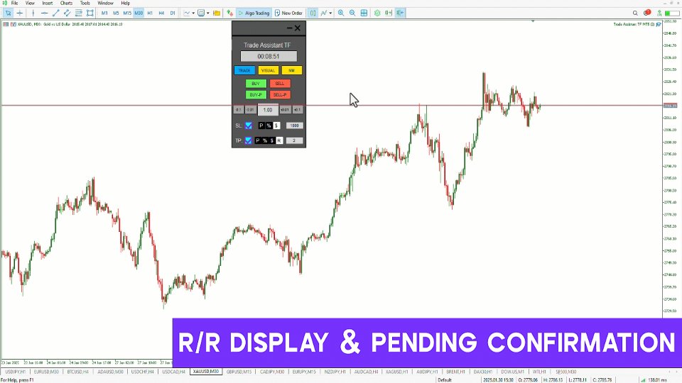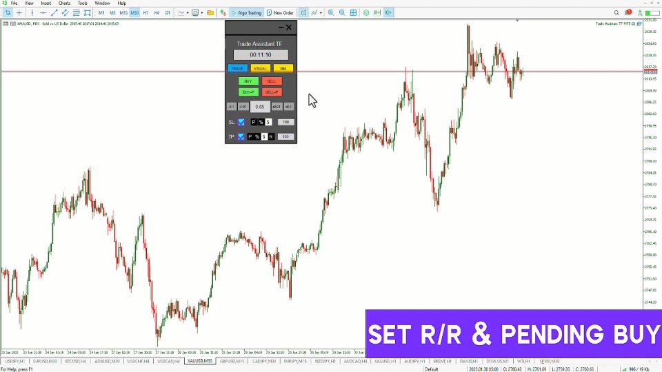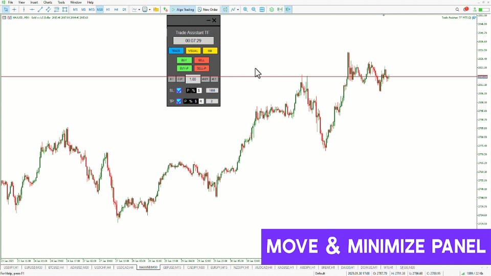 このトレードアシスタントエキスパートTFは、MetaTrader 5 (MT5)向けに設計された高度な取引ユーティリティで、ユーザーフレンドリーなチャートベースのコントロールパネルを通じてポジション管理を強化します。このエキスパートアドバイザーは、取引の実行を簡素化し、リスク管理タスクを自動化し、チャートから直接効率的な資金配分を可能にします。