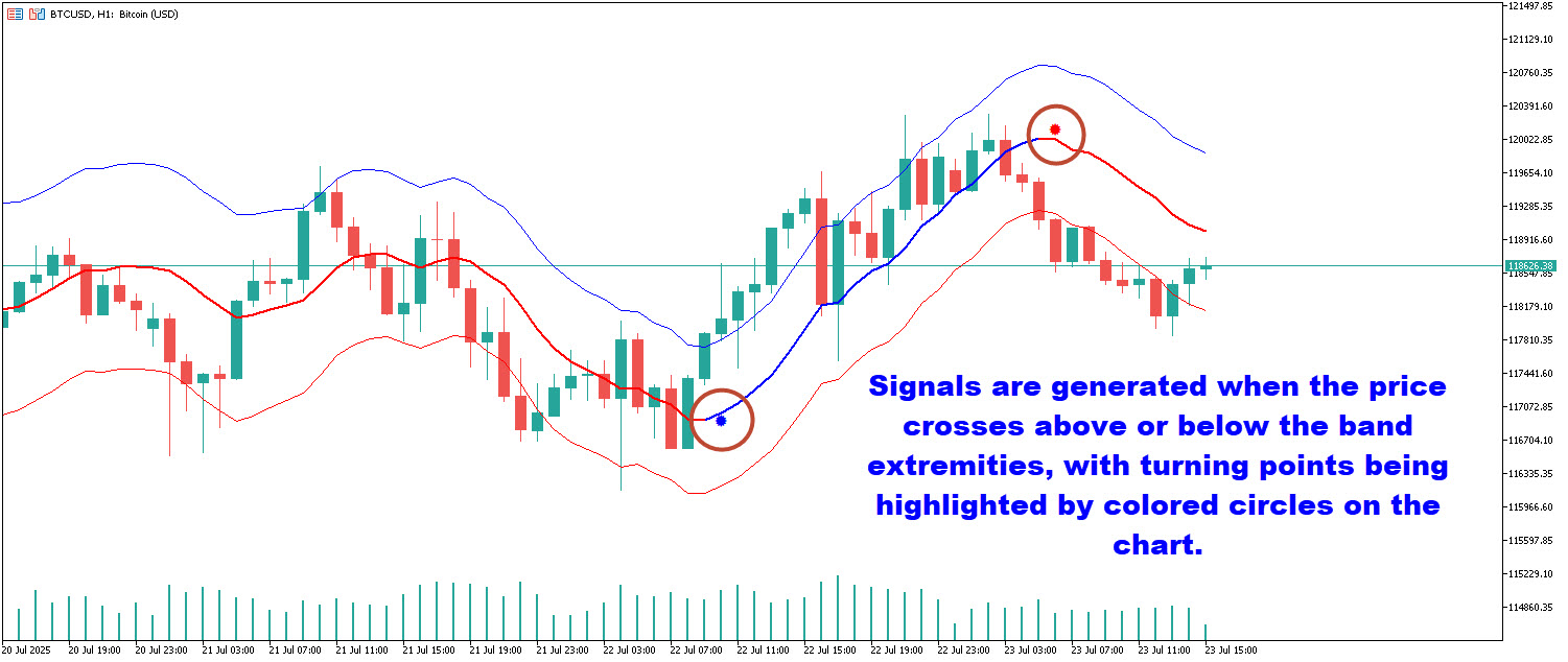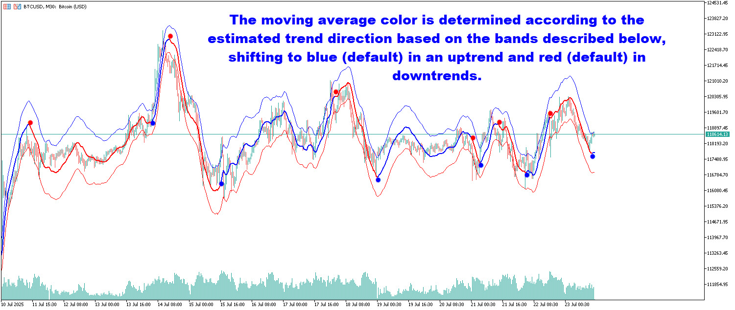 価格がMLMAを上回ったり下回ったりしたときにトレンドの継続または反転を検出します。