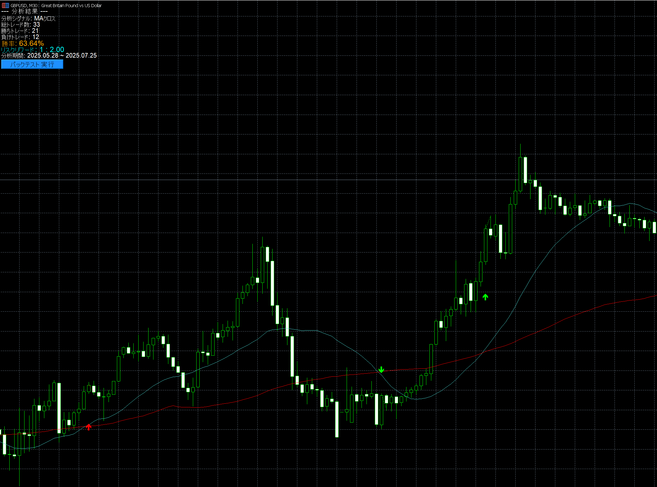 過去のシグナル発生箇所に、勝ちトレード(緑矢印)と負けトレード(赤矢印)を表示。