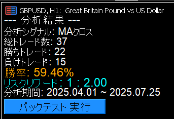 自分の手法を確立したい中級者の方: ご自身が使っている手法の優位性を客観的な数値で確認し、自信を深めることができます。また、パラメーターを少しずつ変えてテストすることで、手法のパフォーマンスを最大限に高める「最適化」が可能です。
