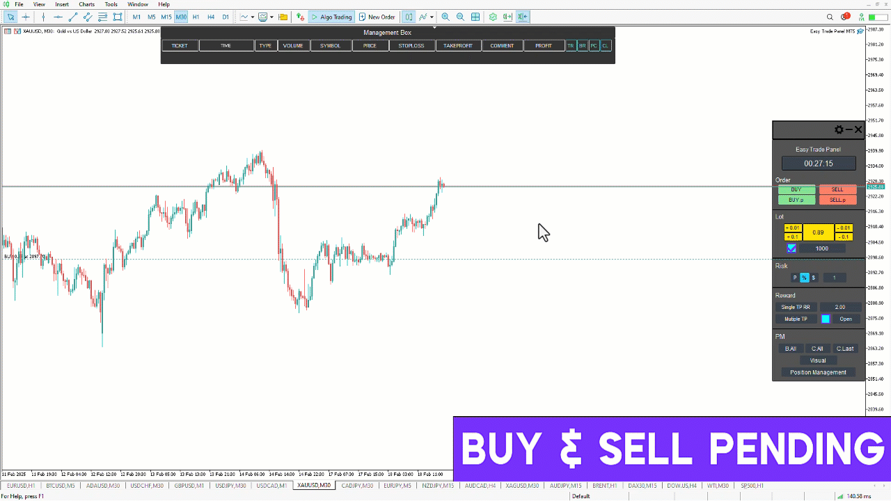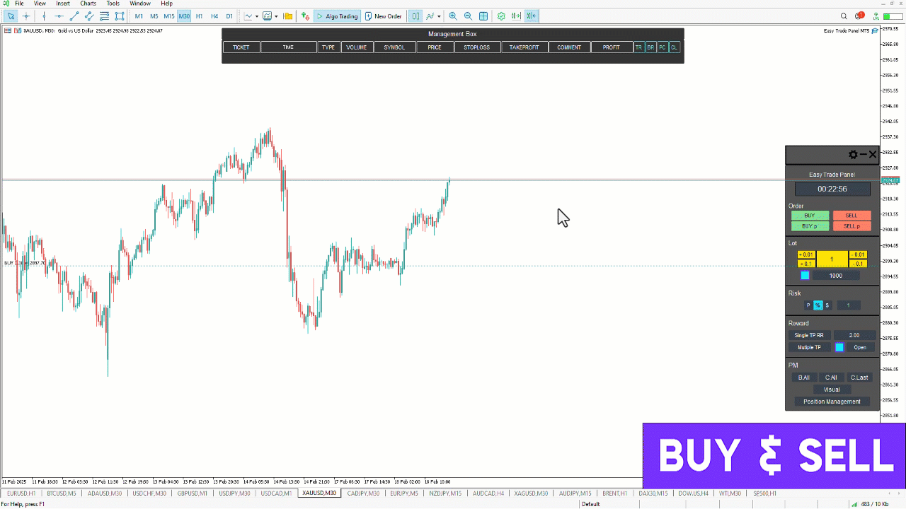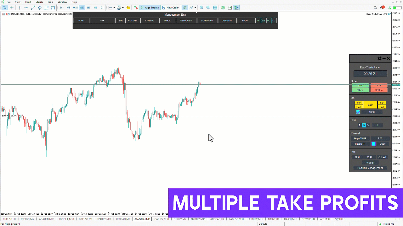 Easy Trade Panel Expert for MT5 は、明確なリスク管理と柔軟なテイクプロフィット戦略を可能にするトレードアシスタントです。