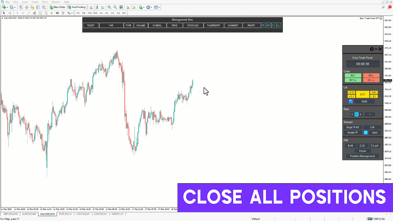 - ポジション管理パネルℳ オープントレードを監視し、ブレイクイーブン、トレーリングストップ、部分決済などの管理ツールを適用して正確なコントロールを行います。